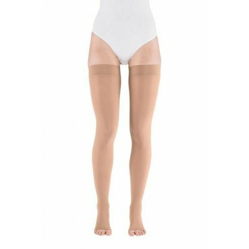 Компрессионные чулки 2-ого класса компрессии mediven plus меди с открытым носком на широкое бедро и силиконовой резинкой как универсальное решение в лечении заболеваний вен. Варикозная болезнь, в том числе у беременных. Варикотромбофлебит. Компрессионная терапия после хирургических манипуляций. Профилактика тромбоза глубоких вен в группах риска. Абсолютные противопоказания: Хронические облитерирующие заболевания артерий нижних конечностей (регионарное систолическое давление на a.tibialis posterior ниже 80 мм рт. ст.); Тяжёлые формы диабетической полинейропатии и ангиопатии; Декомпенсированная сердечно-лёгочная недостаточность; Трофические язвы невенозной этиологии; Острая инфекция мягких тканей; Септический флебит. Относительные противопоказания: Индивидуальная непереносимость материала; Нарушение чувствительности. Трикотаж хорошо растягивается в продольном и поперечном направлениях, что позволяет добиться правильного распределения изделия на ноге и предотвратить образование складок. Специальные технологии вязки поддерживают оптимальный водный и температурный балансы. Серебро в структуре нитей обеспечивает антибактериальный и антигрибковый эффекты в носочной части и борется с возникновением неприятного запаха. Состав материала: Полиамид - 69%; Эластан - 31%.