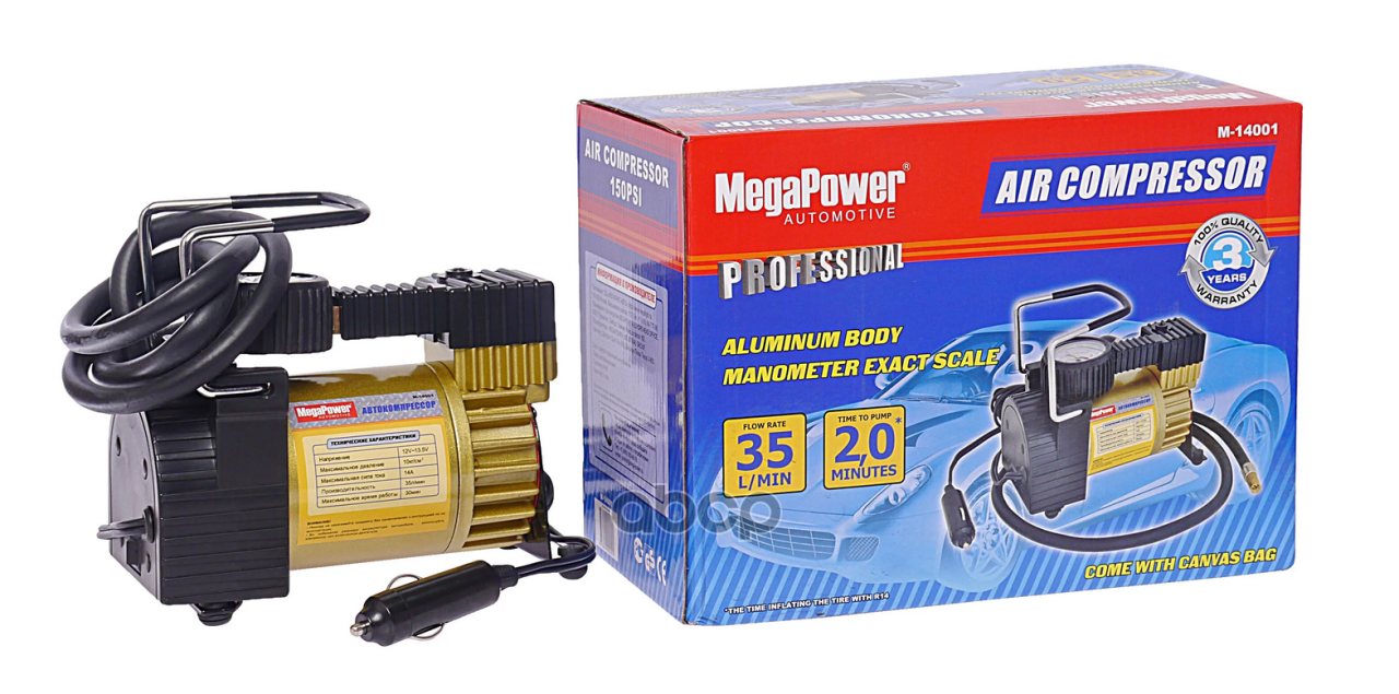 Компрессор автомобильный 35л/мин. 10атм. 14А 12V в прикуриватель (сумка) MEGAPOWER MEGAPOWER Automotive арт. M14001: сравнение цен, характеристики, фото, актуальное наличие и цены.
