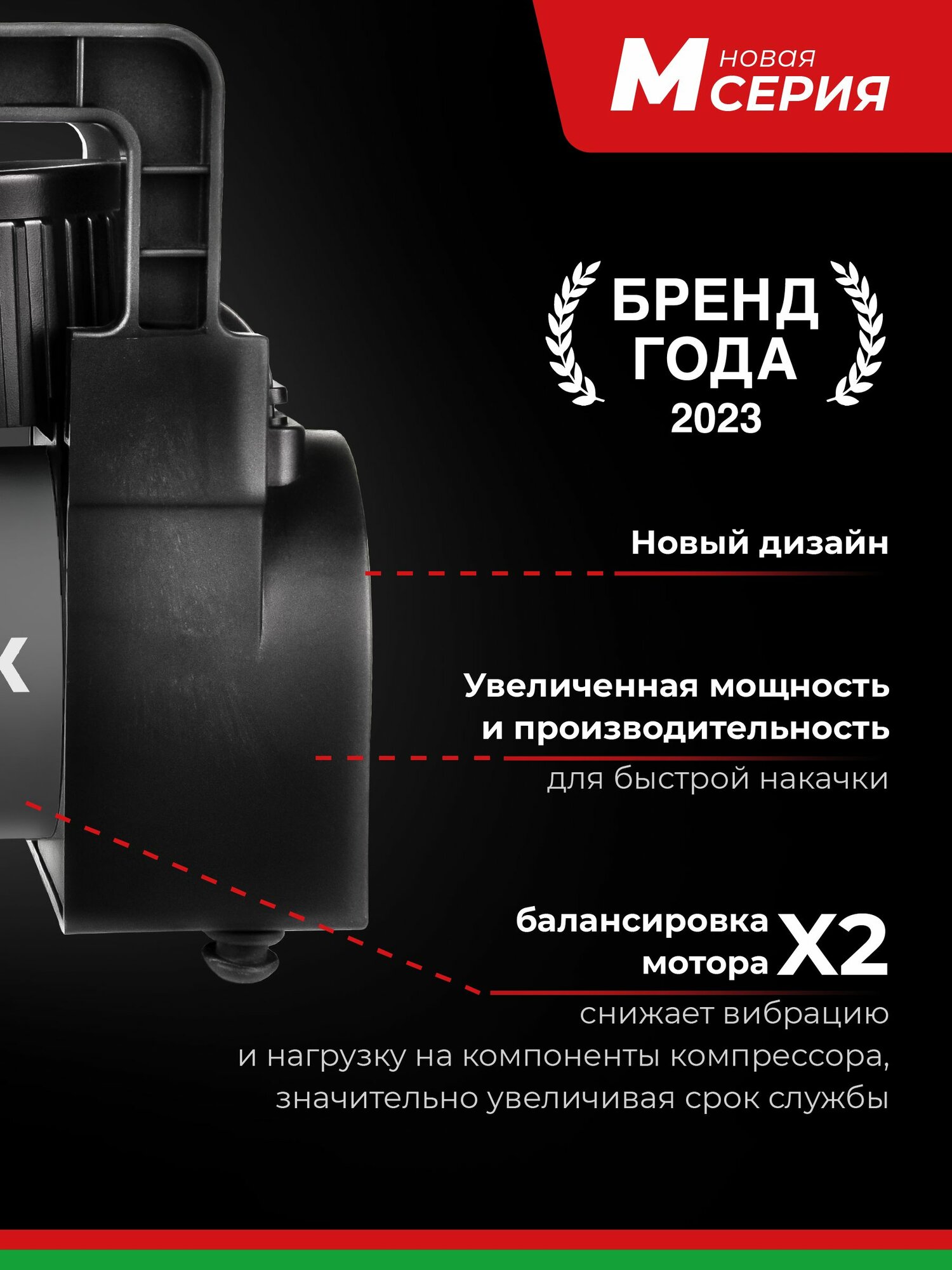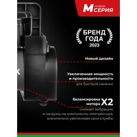 Данная модель принадлежит к новой серии компрессоров «М». Это модифицированная серия компрессоров, которая была создана с учетом потребностей клиентов. Основные отличия серии «М»: новый дизайн; увеличенная мощность и производительность; 2X двойная балансировка мотора (в 2 раза снижает вибрацию и нагрузку на компоненты компрессора, значительно увеличивая срок службы); увеличенная длина провода питания (делает компрессор более универсальным). Бесшумный компрессор обладает мощностью 100 ватт и увеличенными щетками электромотора.