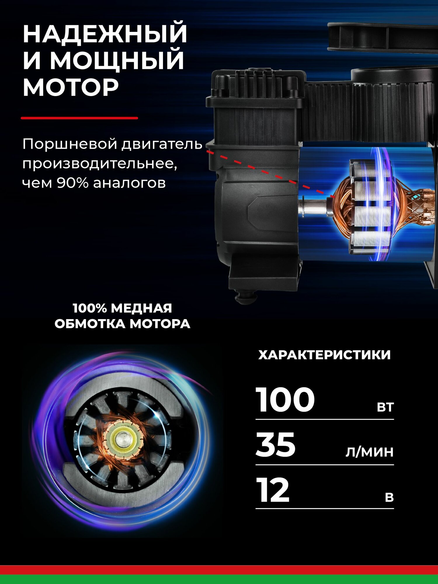 В компрессор встроен мощный и надежный мотор, который защищается специальной медной обмоткой. Двухпоршневой автомобильный компрессор может быть легко замещен однопоршневым с металлическим поршнем и увеличенным двигателем модели. В комплект входит переходник 3 шт. Компрессор является мощным насосом для колес, но также при помощи переходника идеально подойдет как компрессор для лодки ПВХ, накачивания мяча, пляжных или протипролежневых матрасов и шаров. Также может использоваться как велонасос.