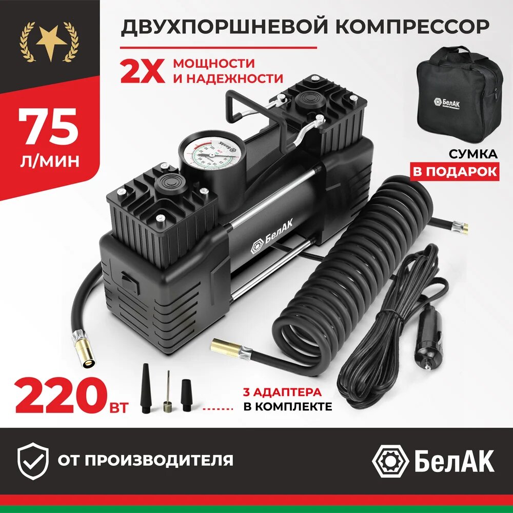 Компрессор автомобильный двухпоршневой Мистраль 75 12V разработан российским производителем БелАК, награждённым девятью национальными премиями "Автокомпонент года". Насос из серии "Мистраль" обладает повышенной мощностью и увеличенными щетками электромотора. Автокомпрессор 12v Мистраль-75 имеет производительность - 75 л/мин(220 вт). В компрессор воздушный установлен мощный двухпоршневой двигатель. Манометр на корпусе удобно использовать и контролировать давление при накачке шин машины. Компрессор Мистраль- 75 (75л/мин) работает с напряжением 12 вольт от прикуривателя. Для работы компрессора рекомендуем использовать розетки прикуривателя с предохранителями 20 ампер или переходник с прикуривателя на клеммы аккумулятора. Предохранитель защищает мотор от повреждения. Шланг высокого давления для компрессора изготовлен из морозоустойчивой резины. Насос автомобильный для накачки колес имеет металлический корпус. Также в комплект входит сумка - чехол для того, чтобы ваш компрессор всегда оставался целым и не терялся. Насос электрический качает быстро как полет птицы беркут. Данная модель накачает надувной матрас, мяч, лодку, велосипед, шины. В комплект входит переходник 3 шт. и прочная сумка. Компрессор БелАК имеет расширенную гарантию от производителя 12 месяцев.