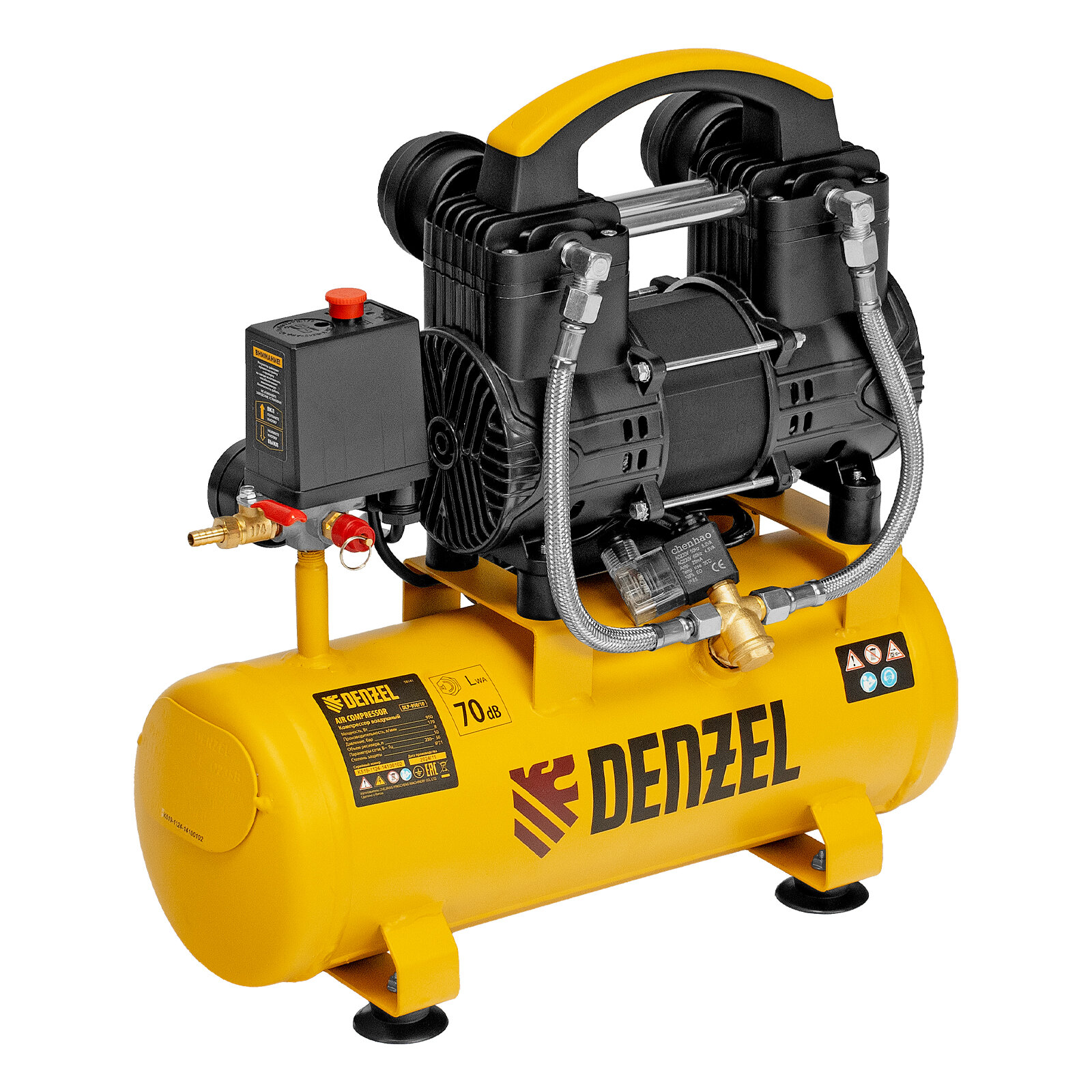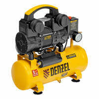Безмасляный малошумный компрессор Denzel DLP-950/10 58141 мощностью 950 Вт и производительностью 170 л/мин, с ресивером объемом 10 л, оснащен двигателем со скоростью вращения 2850 об/мин. Предназначен для обеспечения пневмоинструмента сжатым воздухом. Для работы компрессора не требуется масло, поэтому он подходит для проведения покрасочных работ и продувки электронных компонентов. Прямой привод обеспечивает максимально эффективную работу и высокую производительность. Благодаря низкому уровню шума эксплуатация компрессора не вызывает ощущение дискомфорта. Для подключения шланга пневмомагистрали или пневматического инструмента используется штуцер елка. Преимущества Автономность — специальное реле останавливает компрессор по достижении максимального рабочего давления и запускает двигатель при падении давления до минимального уровня. Безопасность — в случае превышения максимального давления в ресивере срабатывает предохранительный клапан, что позволяет избежать аварийных ситуаций. Контроль давления — компрессор оснащен удобным манометром. Термозащита — двигатель отключается при превышении критической температуры обмоток для предотвращения их оплавления. Защита по току — в случае перегрузки двигатель останавливается, что защищает его от поломки. Регулировка давления — можно установить необходимый уровень в зависимости от подключаемого инструмента. Снижение уровня вибраций — 4 виброопоры гасят колебания, возникающие во время работы. Гарантия 3 года — надежность компрессора подтверждена производителем.