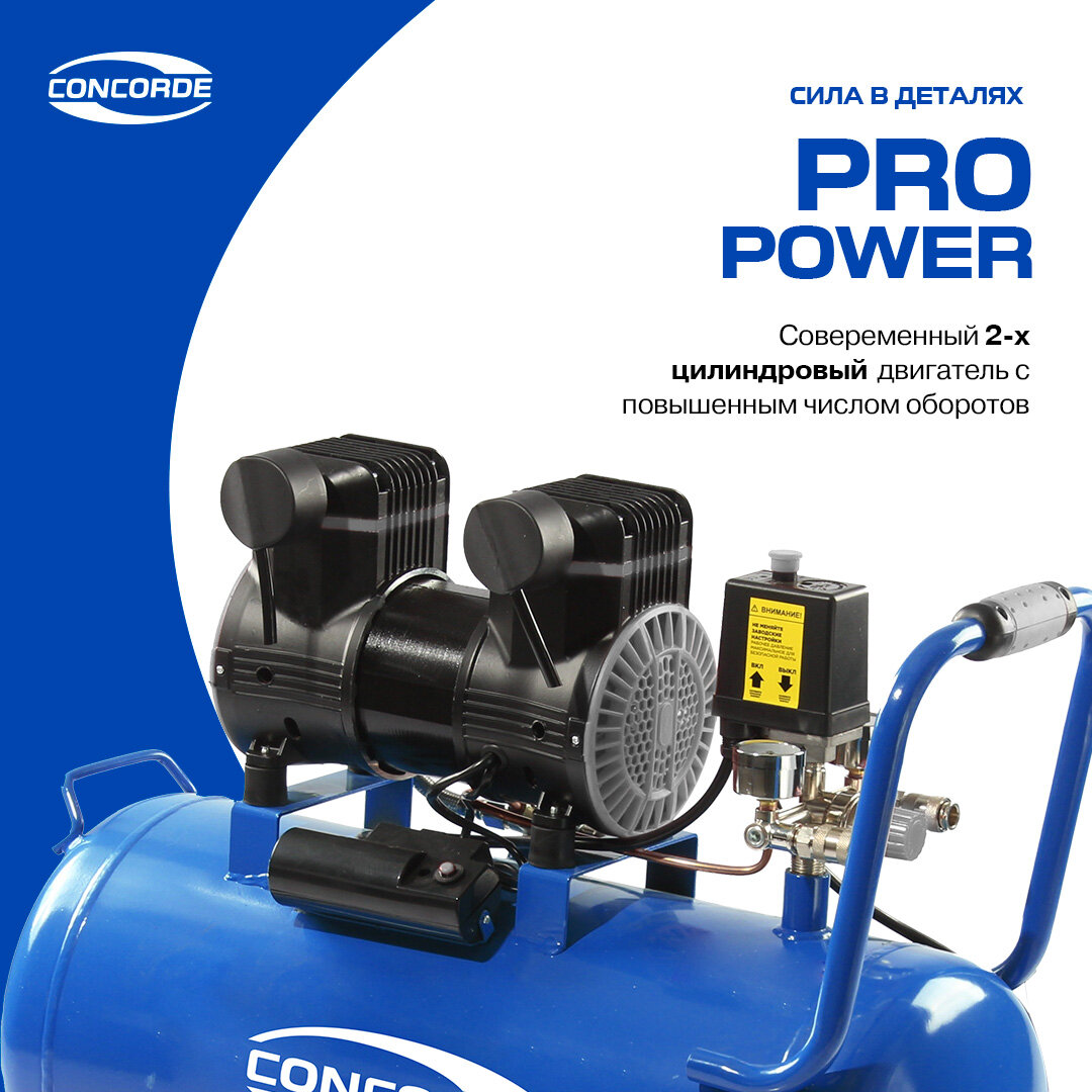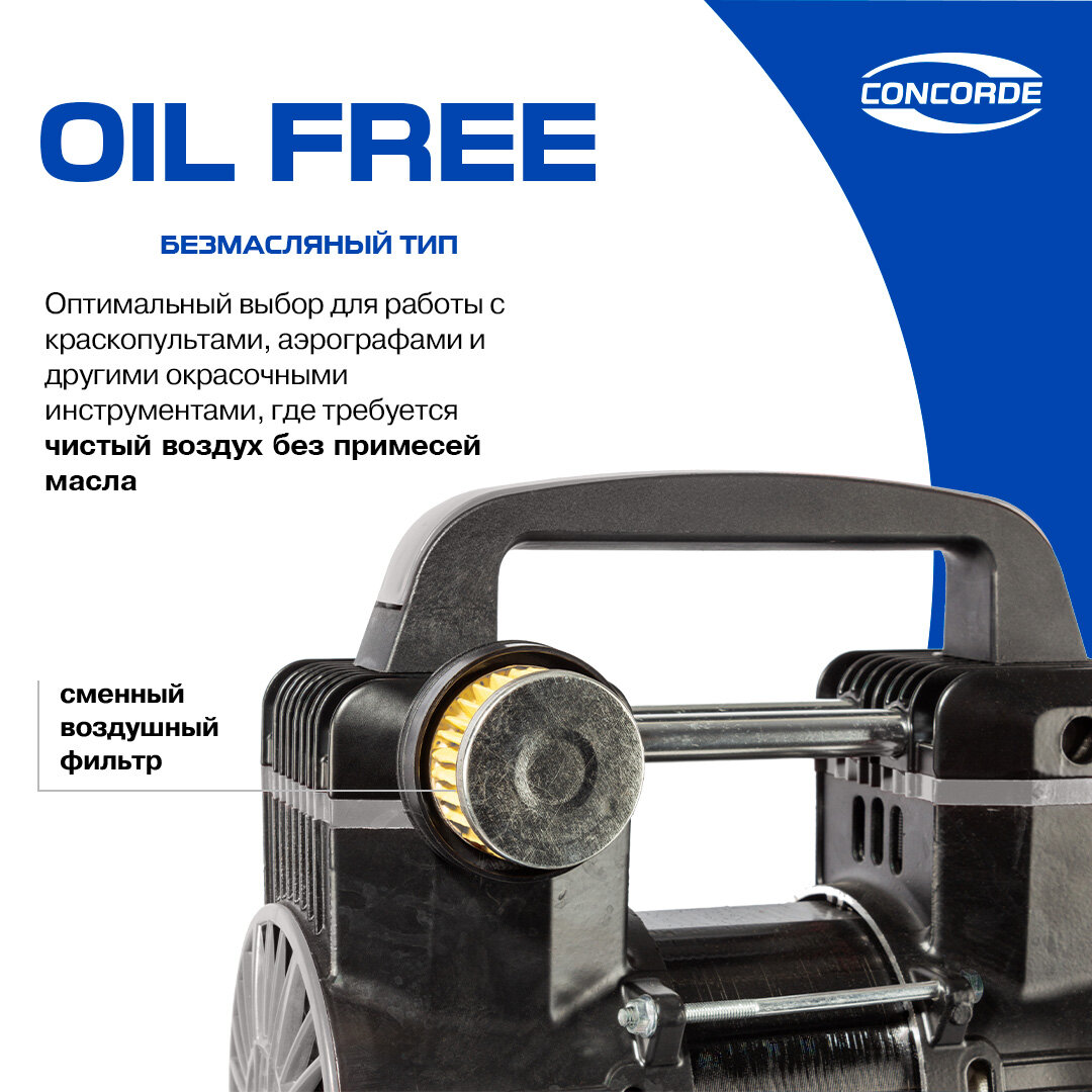 Поршневой компрессор Concorde CD-OC130/24 — это ваш надёжный помощник в гараже, мастерской или на производстве. Он сочетает в себе высокую мощность, технологичность и удобство эксплуатации, обеспечивая стабильную и эффективную подачу воздуха для самых разных задач — от покраски авто до накачки шин. Благодаря современному 2-цилиндровому двигателю с увеличенными оборотами, компрессор работает плавно и тихо, с минимальной вибрацией. Коаксиальный тип прямой передачи гарантирует высокую производительность при компактных габаритах. Подключение к стандартной электросети 220 В делает его универсальным решением как для профессионалов, так и для домашних мастеров. Наличие 24-литрового ресивера позволяет работать без частых перерывов, а встроенный предохранительный клапан обеспечивает вашу безопасность, автоматически сбрасывая давление при перегрузках. Надёжная система контроля — воздушный фильтр и манометр — даёт точные показатели давления и гарантирует чистоту потока. Особое преимущество — безмасляная конструкция, не требующая постоянного технического обслуживания. Вы экономите время и средства, получая при этом идеальный поток воздуха без масляных примесей. Это особенно важно при работе с краскопультами, аэрографами и другими чувствительными инструментами, где важна максимальная чистота воздуха. Благодаря продуманной эргономике, компрессор легко перемещается — прочные колёса и удобная ручка обеспечивают мобильность и комфорт при транспортировке. Более того, безмасляная система позволяет перевозить его в любом положении, не боясь протечек или поломок.