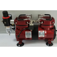 Модернизированный компрессор для создания рабочего давления в аэрографе. Высокая стабильность подачи воздуха, малое потребление электроэнергии, низкий уровень шума, малый вес, два режима работы. Возможно использование с миниатюрными пневмоинструментами.