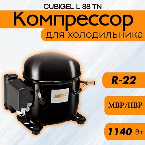 Сubigel L88TN - герметичный поршневой средне- высокотемпературный холодильный компрессор. Применяемый хладагент R22, рабочий объем цилиндра 8,85 см3. В состав комплекта входит: компрессор, пуско-защитная арматура, резиновые виброопоры. Применение: холодильные аппараты, витрины, охладители жидкости, автоматы мороженого, влагопоглотители, сушильные установки и т. д.
