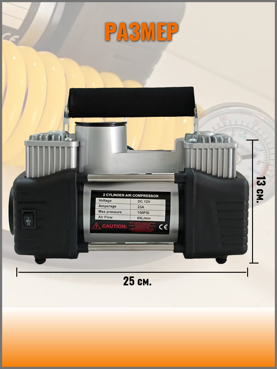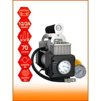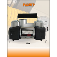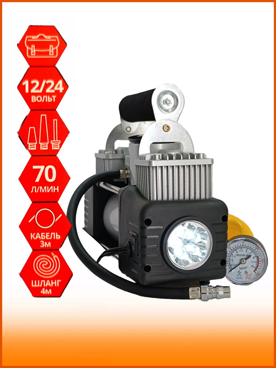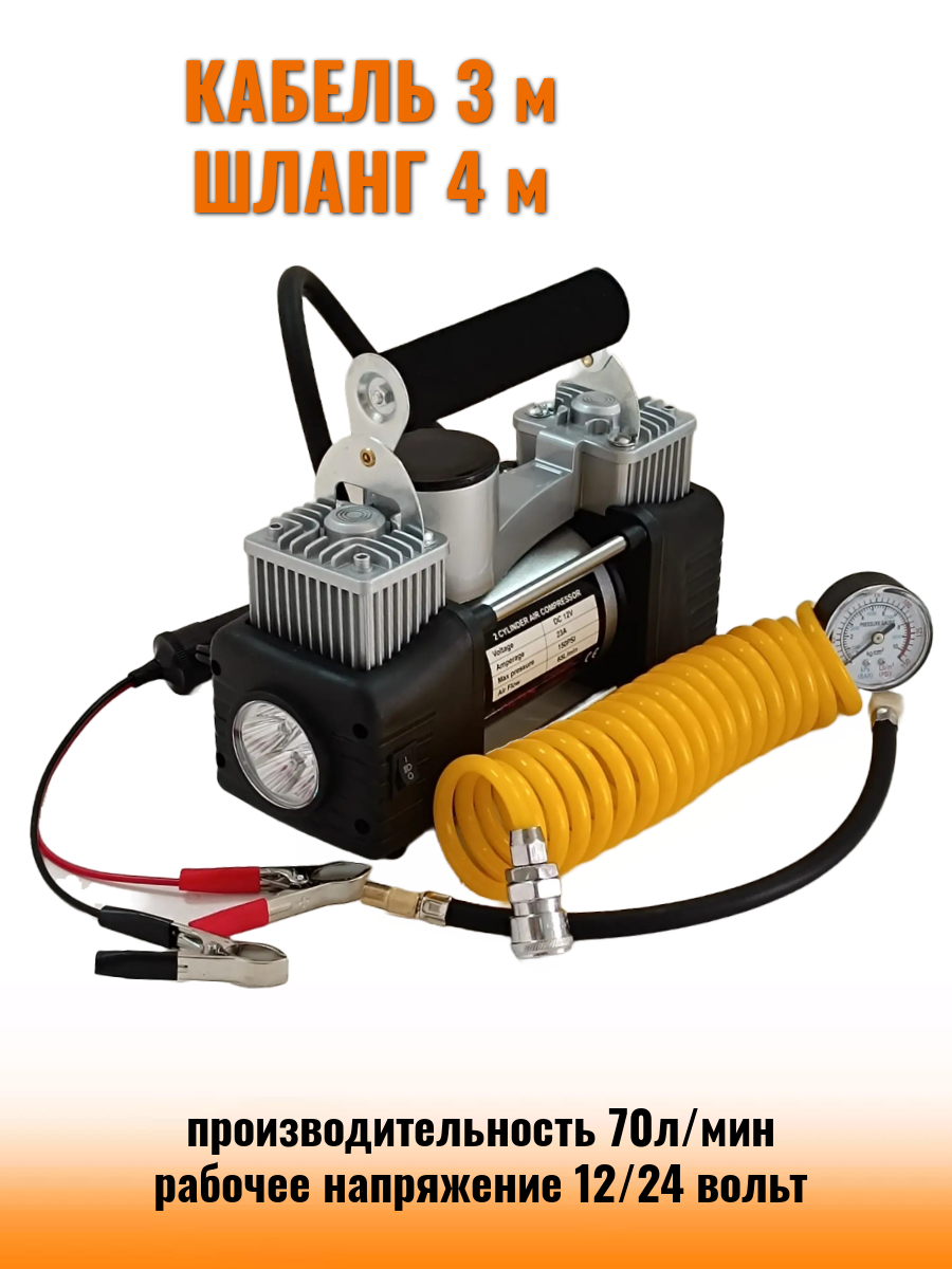 Автомобильный двухцилиндровый компрессор LION, это автоаксессуар и незаменимый помощник в поездках. Мощный автомобильный компрессор 70л/мин быстро и эффективно подкачает колёса не только легковых автомобилей, но и велосипедов, а также идеально подходит для накачивания мячей, матрасов, лодок и других надувных изделий. В основе модели используется производительный двигатель с двумя цилиндрами, благодаря чему обеспечивается высокая производительность и более мощная работа, возможность подключения к клемм аккумулятора или прикуривателю. Компрессор оснащен фонариком, для дополнительного удобства в темное время суток. Корпус насоса выполнен из нержавеющей стали. Четырех метровый спиральный шланг и трех метровый кабель, позволят легко накачать задние колёса транспортного средства без использования дополнительных переходников. Так же в комплект входят дополнительные насадки - переходники и сумка для хранения и транспортировки. Автомобильный компрессор в кейсе это отличный подарок для автолюбителей.