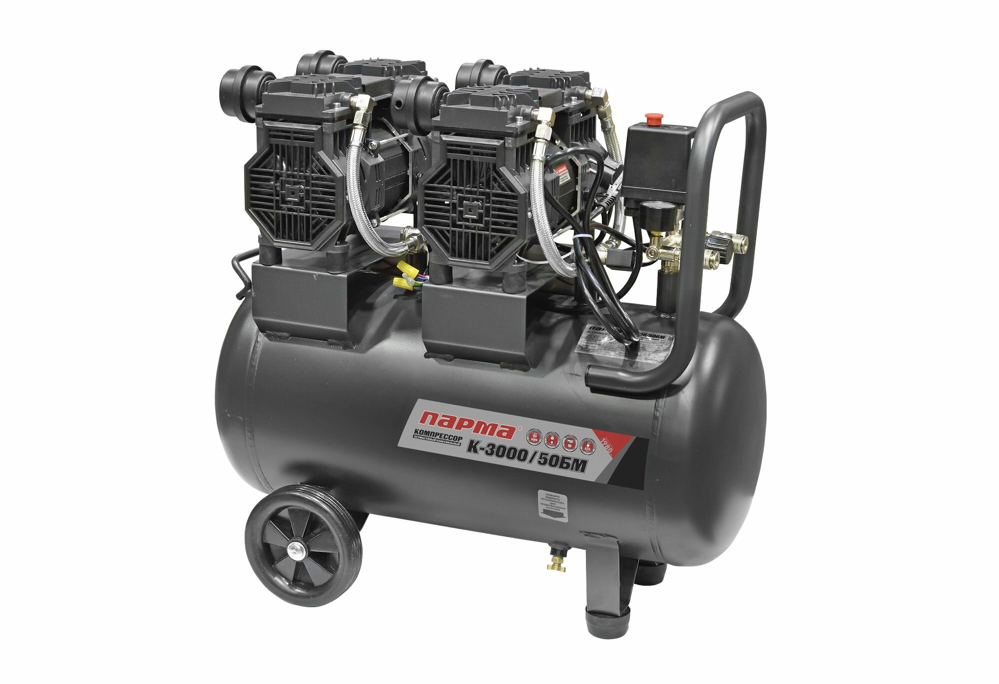 Компрессор Парма K-3000/50БМ безмасляный 2*1500 Вт, 50л, 474 л/м 02.014.00008 подойдет для эксплуатации на небольших производственных площадках, в мастерских при выполнении покрасочных и авторемонтных работ.