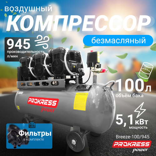 Компрессор является сложным электромеханическим изделием и предназначен для подачи сжатого воздуха в качестве энергоносителя при строительных работах , авто-слесарных работах, в приводах систем автоматики, пневматических машин, оборудование и т. д. Использование компрессора строго ограничено сжатием воздуха, поэтому он не может быть использован для каких-либо иных газов. Не допускается эксплуатация компрессора во взрывоопасных и пожароопасных зонах, под воздействием атмосферных осадков. Режим работы компрессора - повторно-кратковременный. Технические характеристики Breeze 100/945: Сеть - 220В/50Гц Мощность - 5,1 кВт Производительность - 945 л/мин Уровень шума - 58 ДБ Объем накопительного бака - 100л Макс. рабочее давление - 8 Атм Количество двигателей - 3 Комплектация: Воздушный фильтр Шплинт Шайба Колеса Гайка Опорная ножка Штифт Болт
