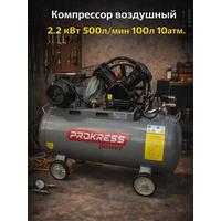 Компрессор воздушный PROKRESS power Taiga 100/500 – это профессиональное оборудование с ременным приводом, предназначенное для работы с пневмоинструментом, покраски, строительных работ, автосервисов и шиномонтажных мастерских. Благодаря производительности 500 л/мин, мощному двигателю 2,2 кВт (2200 Вт) и ресиверу объемом 100 литров, этот компрессор обеспечивает стабильную работу и долговечность даже при регулярных нагрузках. Основные преимущества ✔ Высокая производительность – 500 л/мин – достаточная мощность для работы с пневмоинструментом, краскопультами и автосервисным оборудованием. ✔ Мощность 2,2 кВт (2200 Вт) – оптимальное сочетание мощности и энергопотребления. ✔ Ременной привод – снижает нагрузку на двигатель, продлевая срок службы компрессора. ✔ Компрессор масляный – система смазки обеспечивает защиту внутренних элементов и увеличивает срок эксплуатации. ✔ Давление 10 бар (10 атмосфер) – идеально подходит для пневматического инструмента и шиномонтажного оборудования. ✔ Компрессор с колесами – удобен для перемещения по рабочей зоне. ✔ Низкий уровень шума и вибрации – благодаря ременной передаче компрессор работает тише аналогов, обеспечивая комфорт при использовании. Технические характеристики Тип компрессора: поршневой, ременной Мощность: 2,2 кВт (2200 Вт) Производительность: 500 л/мин Давление: 10 бар (10 атмосфер) Напряжение: 220В (работает от стандартной бытовой сети) Ресивер: 100 литров Обороты двигателя: 2850 об/мин Вес: 79 кг