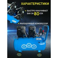 манометр, Автоматическое отключение по достижению заданного давления, Датчик уровня масла, Колеса, Низкий уровень шума, Ресивер, Рукоятка для переноски, Спускной клапан