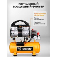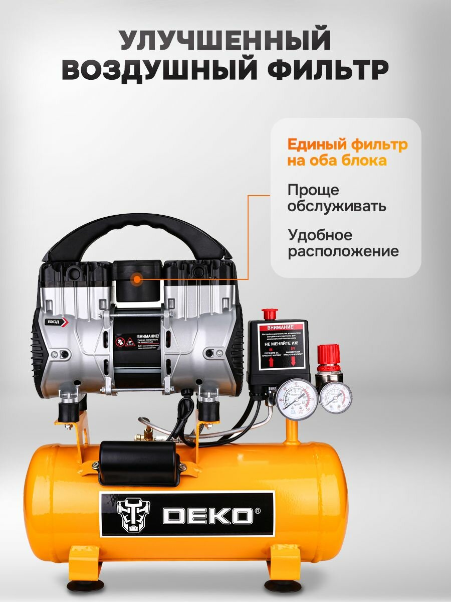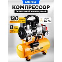Компрессор DEKO DKAC-O10 — малошумный безмасляный аппарат поршневого типа для решения широкого спектра технических задач. Модель предназначена для эффективной работы с пневмоинструментом, включая краскопульт, аэрограф и пескоструйный пистолет. Устройство мощностью 750 Вт обеспечивает стабильную производительность 120 литров воздуха в минуту. Компрессорная установка оснащена ресивером объемом 10 литров, что способствует накоплению необходимого запаса сжатого воздуха и снижает нагрузку на двигатель. Максимальное давление в 8 Бар делает данный воздушный компрессор универсальным решением для гаража, мастерской или дачи. Он оптимально подходит для выполнения таких работ, как подкачка шин автомобиля, покраска поверхностей и очистка деталей. Благодаря питанию от сети 220В и безмасляной конструкции, аппарат не требует специализированного обслуживания и готов к работе сразу после подключения. Низкий уровень шума позволяет комфортно использовать эту мини-станцию в закрытых помещениях. Этот компрессор для авто и бытового применения сочетает в себе надежность, достаточную производительность и простоту эксплуатации.