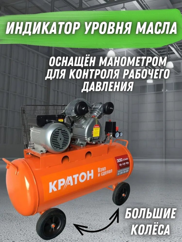 Описание товара Назначение Поршневой компрессор AC-300-100-BDV марки Кратон, с ременным приводом, обладает большим эксплуатационным ресурсом и высокой производительностью, что позволяет использовать его практически с любыми пневмоинструментами. Компрессор питается от электросети 220 V и оснащен колесами и резиновыми опорами, благодаря которым его можно устанавливать как в цеху, так и в небольшом, оборудованном для этого гараже и при необходимости перемещать на небольшое расстояние. Особенности Давление на выходе, бар — 10. Расход воздуха равен 300 л/мин. Потребляемая мощность — 1800 Вт. Вес конструкции составляет 98 кг. Количество цилиндров — два. Скорость вращения двигателя, об/мин — 2800. Преимущества Ресивер объемом на 100 л обеспечивает на выходе стабильное рабочее давление. Защитный кожух предохраняет ременную передачу от механических повреждений. Конструкция компрессора предусматривает предохранительный клапан для сброса избыточного давления и автоматическую защиту двигателя от перегрева во время интенсивного использования. Благодаря ременному приводу крутящий момент передается мягко и без рывков, что позволяет увеличить срок службы механизма. Комплектация 1. Компрессор с ременной передачей Кратон AC-300-100-BDV — 1 шт.