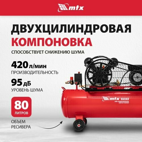 Купить Mtx Компрессор воздушный ременный привод КР2500/80, 2,5 кВт, 80 литров, 420 л/мин, , 58022 с доставкой по всей России.