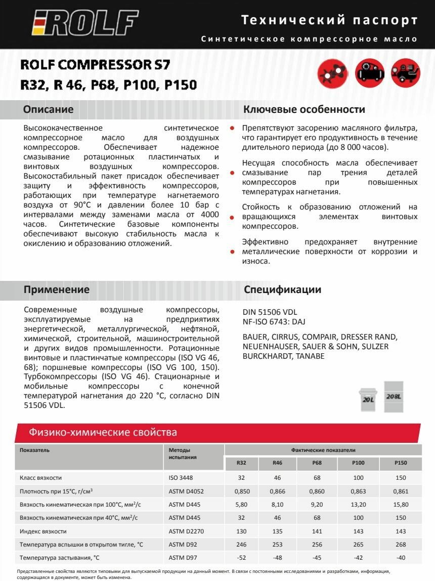 ROLF COMPRESSOR S7 – серия высококачественных компрессорных масел созданных на основе гидроочищенных базовых масел с высоким индексом вязкости, усиленных алкилированными нафталинами (AN), предназначенных для смазки ротационных, винтовых, пластинчатых и поршневых воздушных компрессоров, эксплуатируемых в тяжелых условиях. Содержат высокоэффективный беззольный пакет присадок обеспечивающий высокие противоокислительные, противоизносные и противокоррозионные свойства. Тщательно подобранные базовые масла и пакет присадок обеспечивает защиту от образования отложений на внутренних рабочих поверхностях, вращающихся элементах, сепараторах и коагуляторах тем самым способствуют продлению срока службы оборудования и снижению затрат на техническое обслуживание. Высокая термическая и окислительная стабильность делает возможным работу масел при повышенных температурах на линии нагнетания продолжительное время. Масла данной серии характеризуются увеличенным интервалом замены 4000 часов и выше (в зависимости от рекомендаций производителя оборудования и условий эксплуатации).