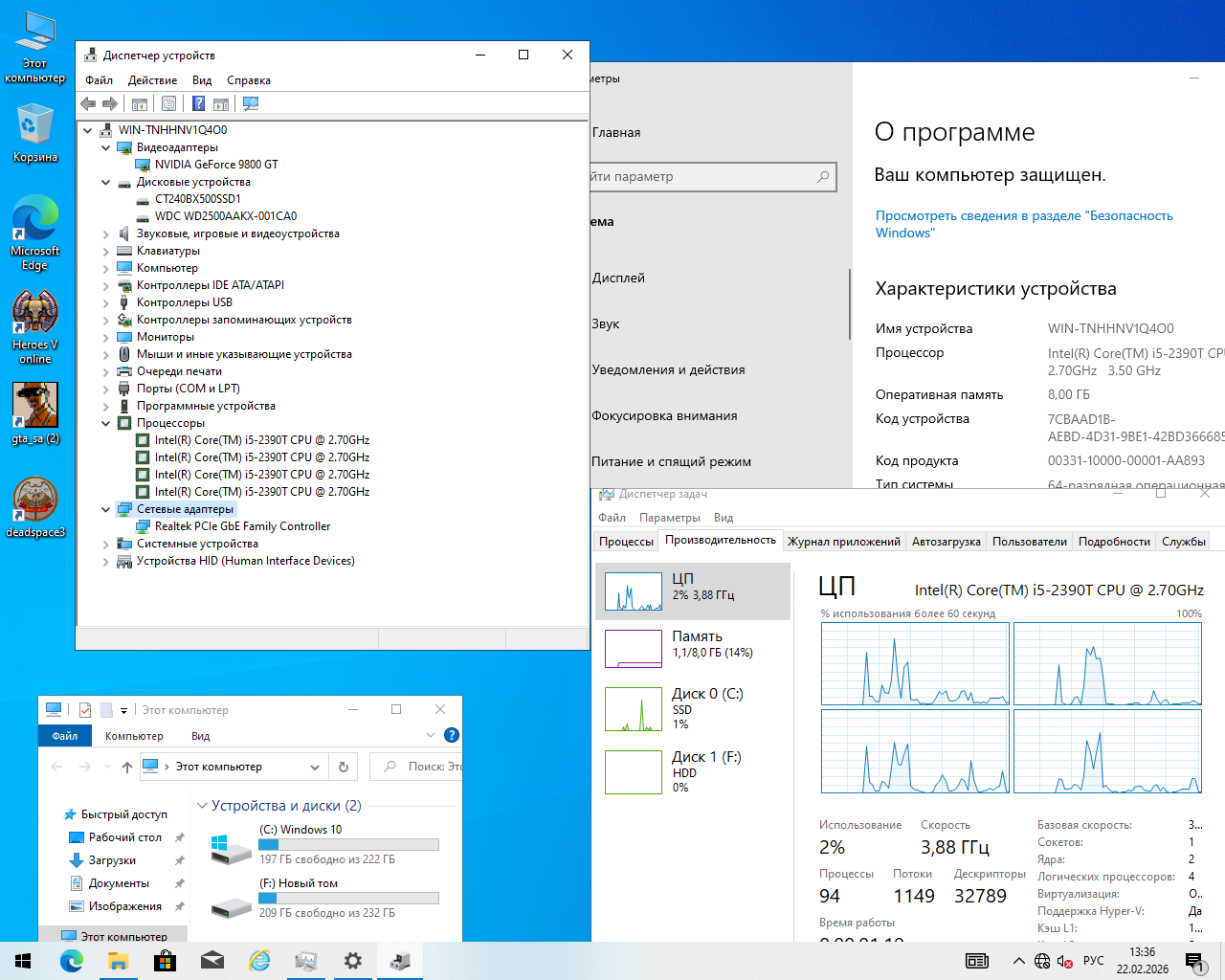 Компьютер оснащен процессором Intel Core i5-2390T с частотой 2.7-3.5 ГГц и меет 4 потока, который обеспечивает высокую производительность и быстродействие при выполнении различных задач, включая игры и работу с графическими приложениями. 8 ГБ оперативной памяти позволяют запускать несколько приложений одновременно без снижения производительности.