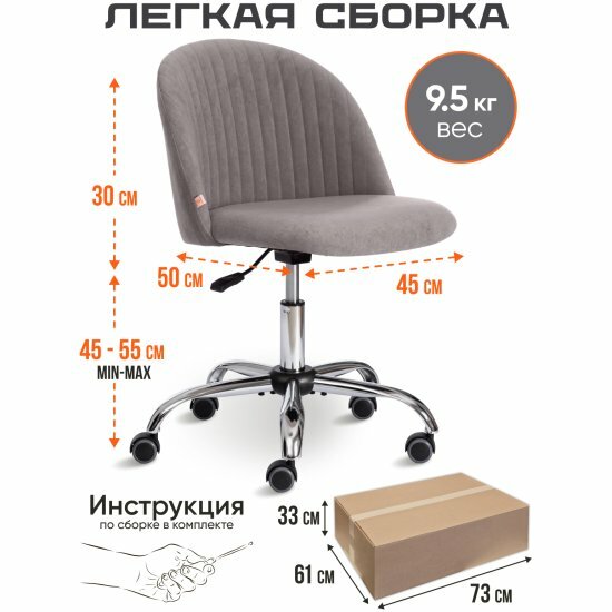 пятилучье - 1 шт., ролики - 5 шт., газлифт - 1 шт., механизм с рычагом подъема - 1 шт., спинка-сиденье - 1 шт., втулка пластиковая - 2 шт., документация