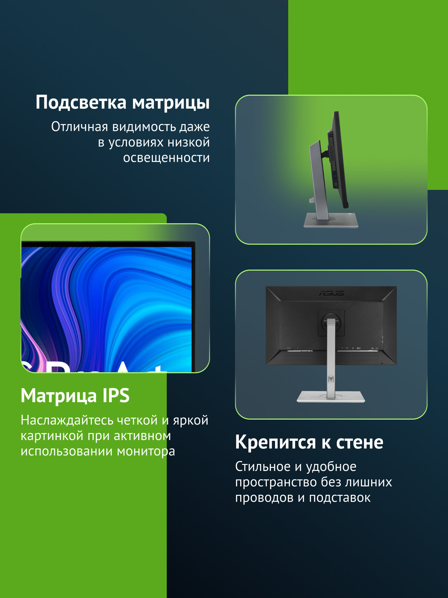 встроенные колонки, поворот на 90 градусов, подсветка без мерцания (Flicker-Free), регулировка по высоте