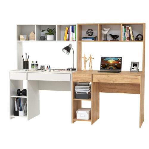 | Дополнительная информация | располагает большими столешницами и вместительной системой хранения для двоих деток, система хранения каждого стола разнообразна - это надстройка с открытыми нишами, открытая тумба со съёмной полкой и два выдвижных ящика стола, защитная ниша надстройки вполне достаточна для установки монитора любого размера, а тумба подойдёт для установки системного блока, стол с множеством открытых ниш, визуально лёгкий, привлекает эргономичностью и стильным дизайном, собираются на любую сторону - при сборке Вы можете расположить тумбу как слева, так и справа |