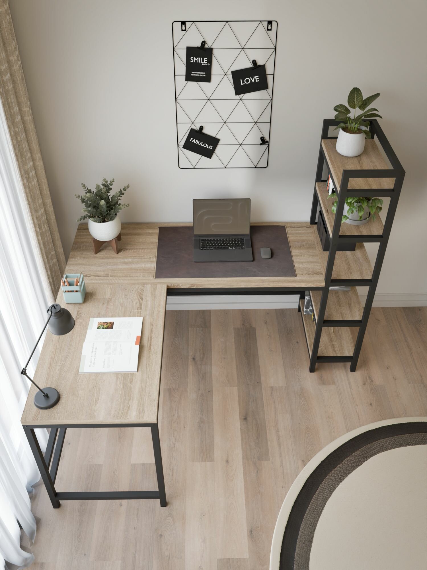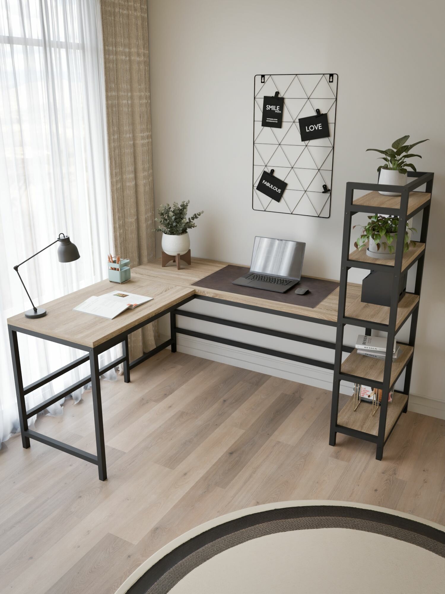 Металлический каркас (профильная труба 20х20) обеспечивает надежность и долговечность, при этом сохраняя визуальную легкость конструкции, не перегружая интерьер. Столешница и полки выполнены из ЛДСП и обладают повышенной устойчивостью к механическим воздействиям: нагрузкам и царапинам.