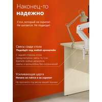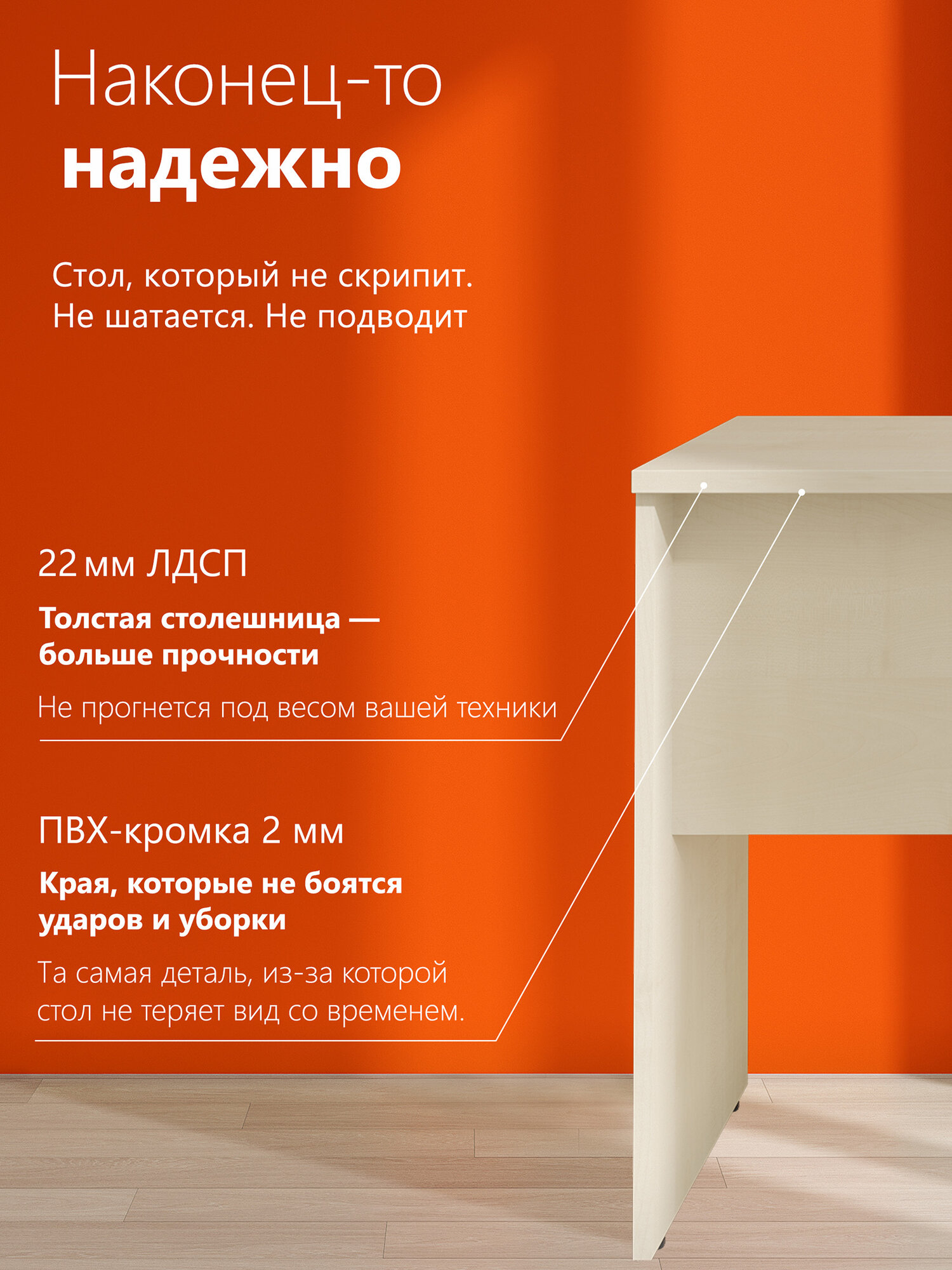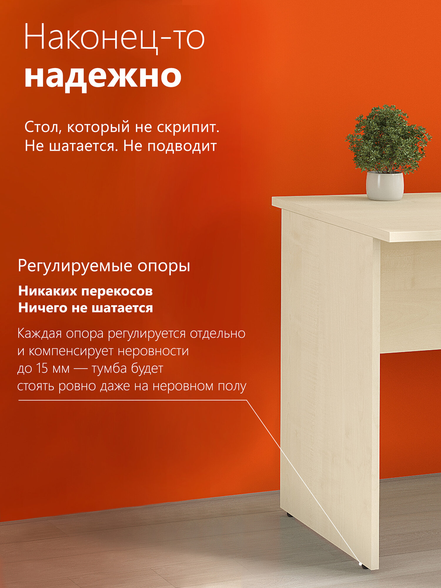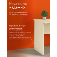 Рабочий стол оснащен солидной столешницей 22 мм и прочными опорами 18 мм из ЛДСП. Противоударная кромка ПВХ толщиной 2 мм защищает торцы письменного стола от повреждений. А регулируемые по высоте опоры обеспечат устойчивость на неровном полу.