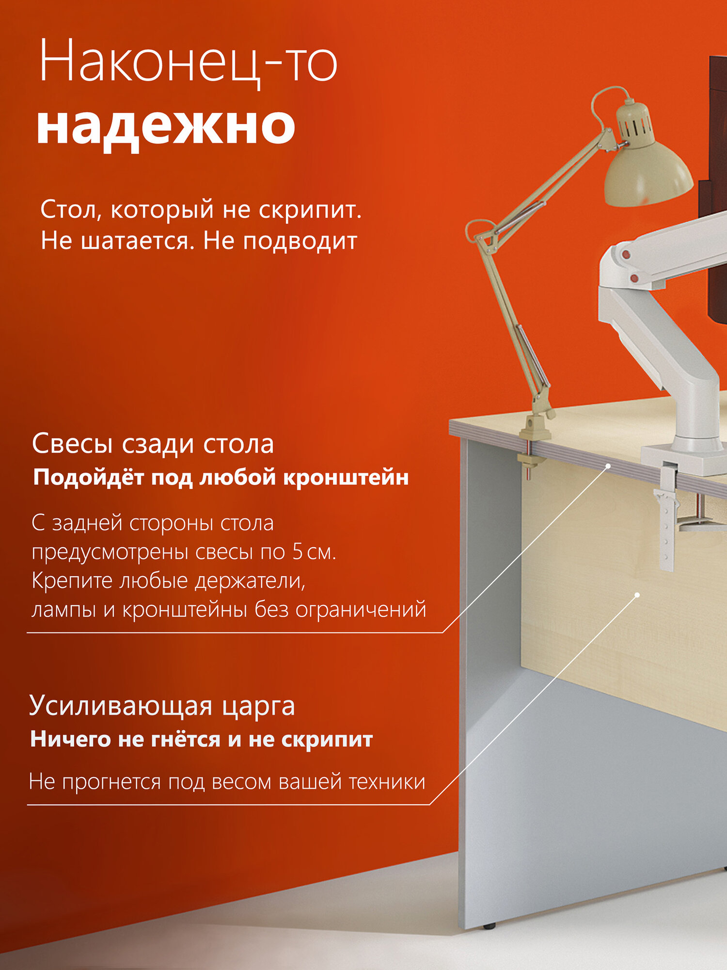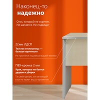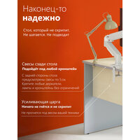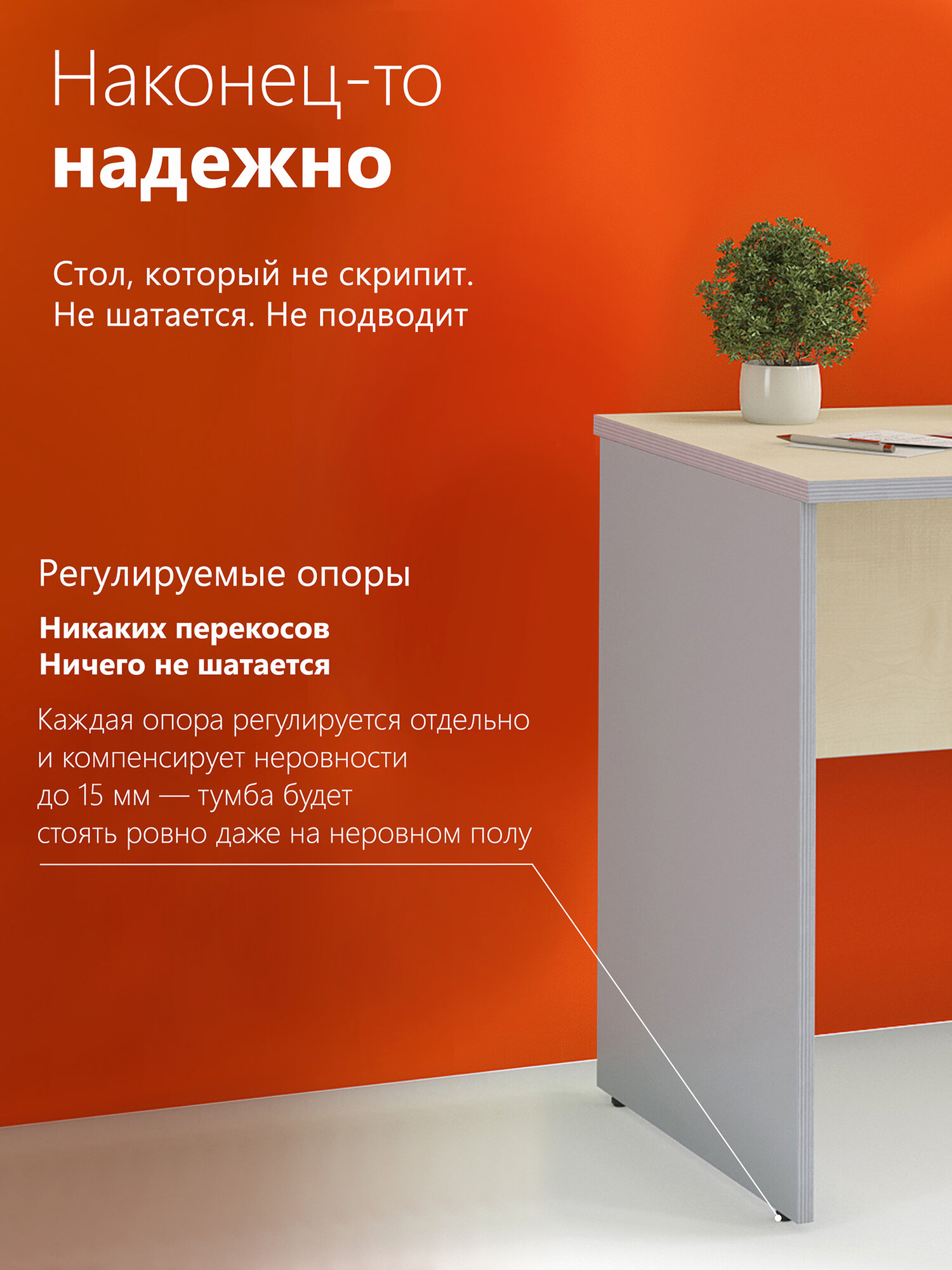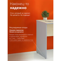 Рабочий стол оснащен солидной столешницей 22 мм и прочными опорами 18 мм из ЛДСП. Противоударная кромка ПВХ толщиной 2 мм защищает торцы письменного стола от повреждений. А регулируемые по высоте опоры обеспечат устойчивость на неровном полу.