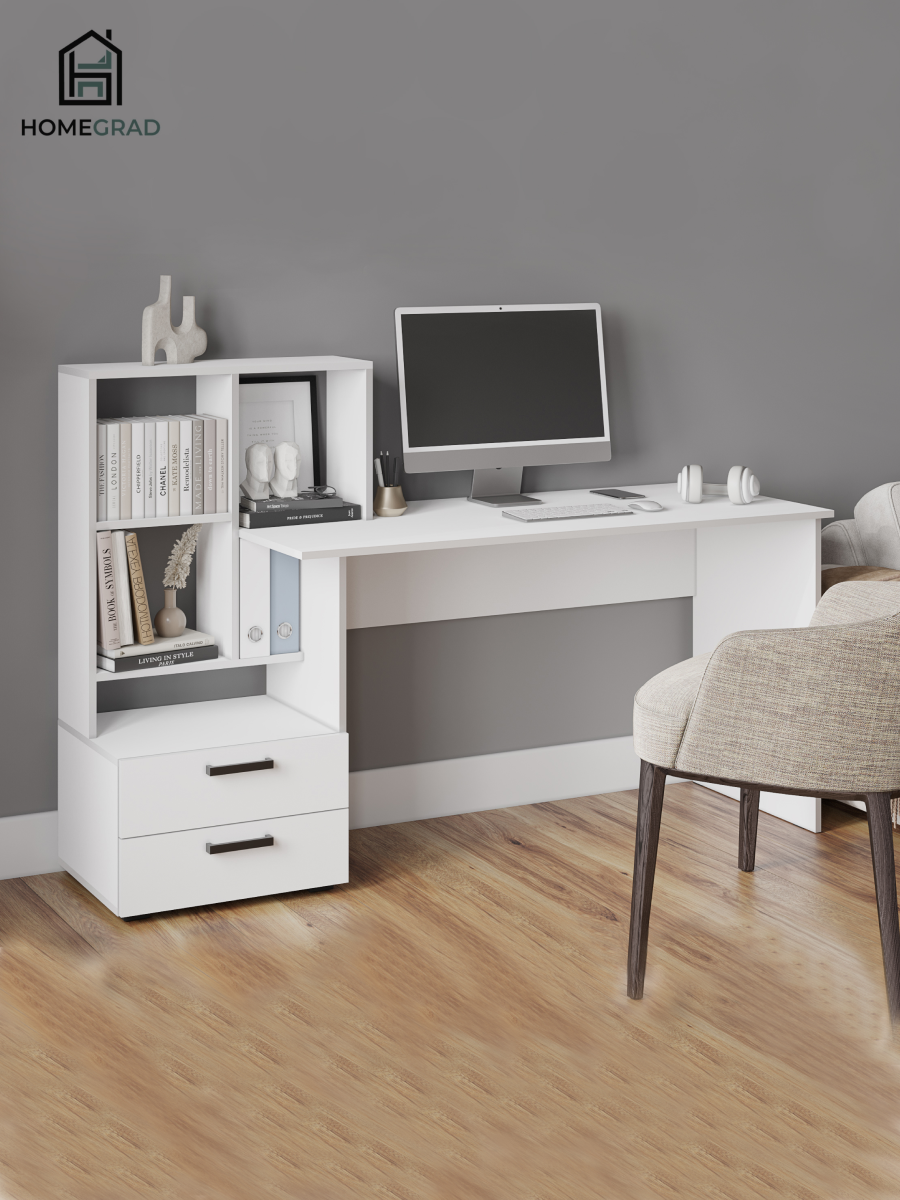 Стол письменный белый с полками и ящиком заменит полноценное рабочее место и зону хранения для школьника или взрослого, работающего на дому. Компьютерный стол в белом цвете сочетается с любой белой мебелью -шкафы, комоды, кровати, тумбы под тв. Ящики позволяют аккуратно хранить книги, тетради, документы, канцелярские принадлежности, игрушки и др. мелочи, не допуская их беспорядка. Полка для мелочей выполнит роль подставки для органайзера или небольших книг. Письменный стол также можно использовать как компьютерный стол, а ниша с полками сбоку стола будет дополнительным местом для хранения папок, телефона и мелочей для оргтехники. Компьютерный, письменный стол станет любимым рабочим местом для ребенка. Стол имеет оптимальные размеры, при относительно небольших габаритах -очень вместительный и комфортный, подойдет для спальни, детской, гостиной, балкона, кабинета в квартире, доме или на даче.