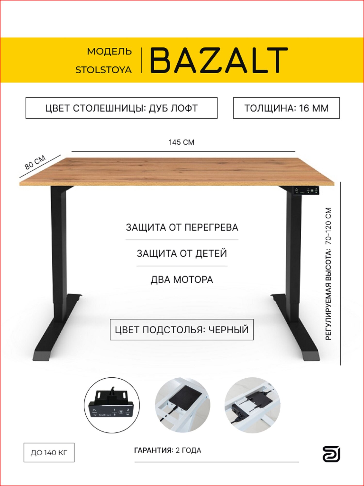 Стол с регулировкой высоты: рама Атлант черная и Столешница ЛДСП Дуб Лофт 145х80х1.6 см Высокий компьютерный стол для работы стоя и сидя от производителя StolStoya помогает менять положение одним нажатием, повышает производительность и заботится о вашем здоровье. В обе опоры встроен электроподъемник с регулировкой по высоте от 72 до 122 см. Встроенная панель управления отображает текущую высоту и помогает менять положение одной кнопкой.