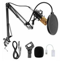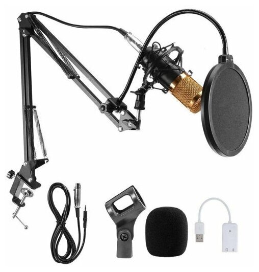 микрофон BM-800, крепление микрофона "паук" к штативу, штатив для микрофона, крепление для штатива к столу, поп фильтр, ветровичек, XLR кабель, USB внешняя звуковая карта