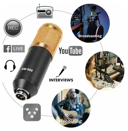 Набор с профессиональным конденсаторным микрофоном BM 800 удобен для записи видео и аудио подкастов, для блогеров, ютьюберов. Обладает отличными аудио и техническими характеристиками. В комплекте идет все необходимое для установки - распаковываете коробку, собираете на столе в течение пары минут, подключаете микрофон и можете записывать! Для подключения к ПК требуется звуковая карта (идет в комплекте). Обычно ее достаточно для работы. Идеален как основной или вспомогательный микрофон для студийного и домашнего использования. Рекомендуется использовать внешнюю звуковую карту с фантомным питанием или отдельный модуль фантомного питания на15 - 48 вольт.