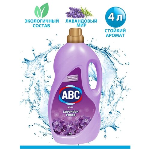 Смягчитель для белья ABC Лавандовый мир. Смягчитель для белья Марки АВС выполняет функции кондиционера для стирки белья, применяется при стирке в качестве дополнительного средства. Он добавляется в воду при последнем полоскании, что делает стирку более качественной, а белье более мягким. Кондиционер придает белью антистатические свойства и приятный запах, делает его цвет более стойким и облегчает последующее глажение.