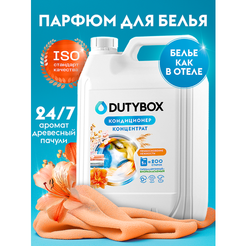 Кондиционер - ополаскиватель для белья DUTYBOX "Древесный пачули" 5л, 200 стирокКонцентрированный кондиционер Dutybox с ароматом "Древесный пачули" придает белью мягкость после стирки и свежий аромат.