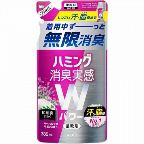 KAO Humming W Power Herbal Soap Кондиционер-ополаскиватель для белья, с антибактериальным и дезодорирующим эффектом, с ароматом травяного мыла, сменный блок 380 мл. Кондиционер KAO Humming W Power содержит двойные дезодорирующие компоненты для устранения неприятных запахов, таких как запах пота, кожного сала, сырости и т. п.