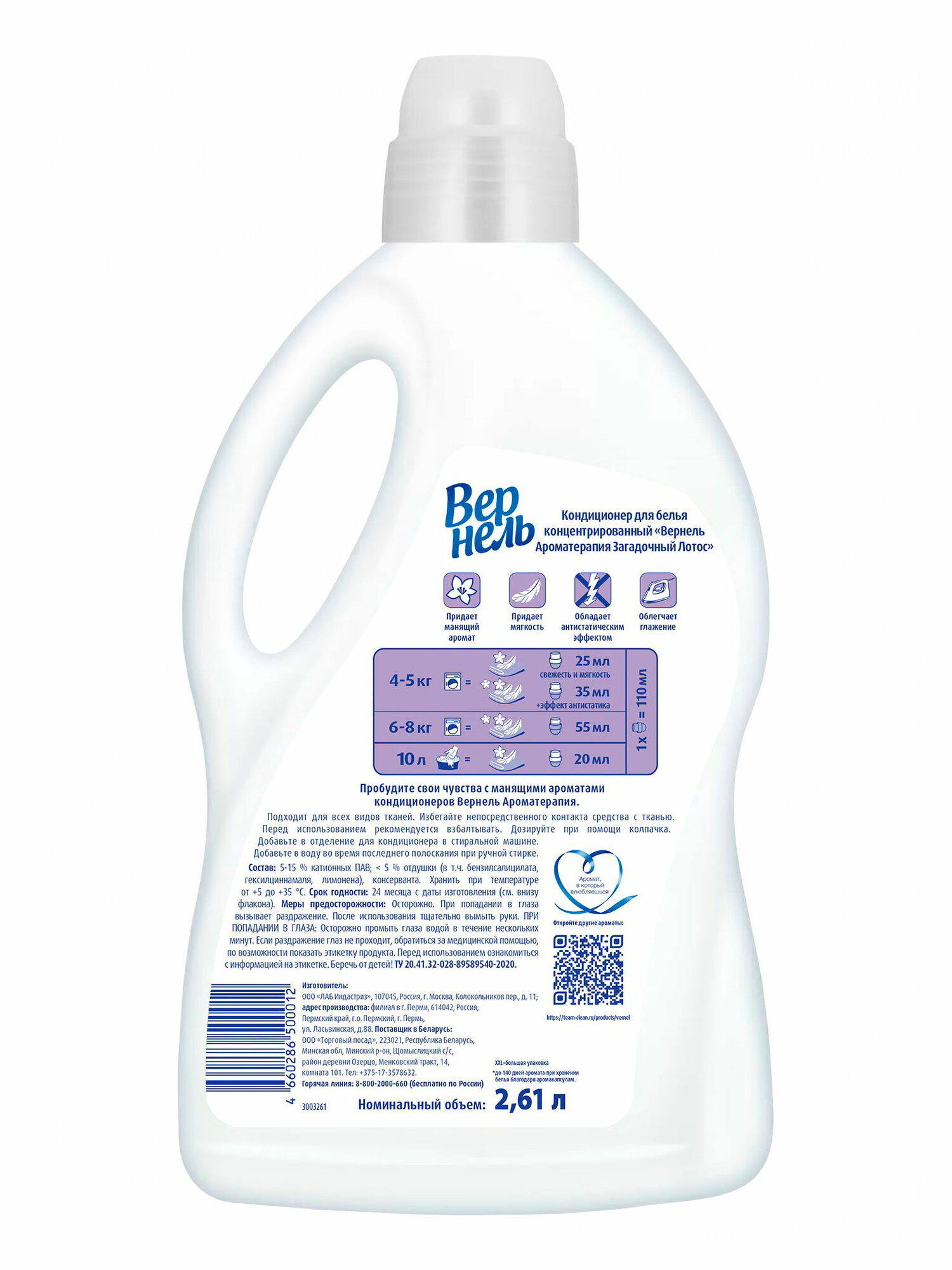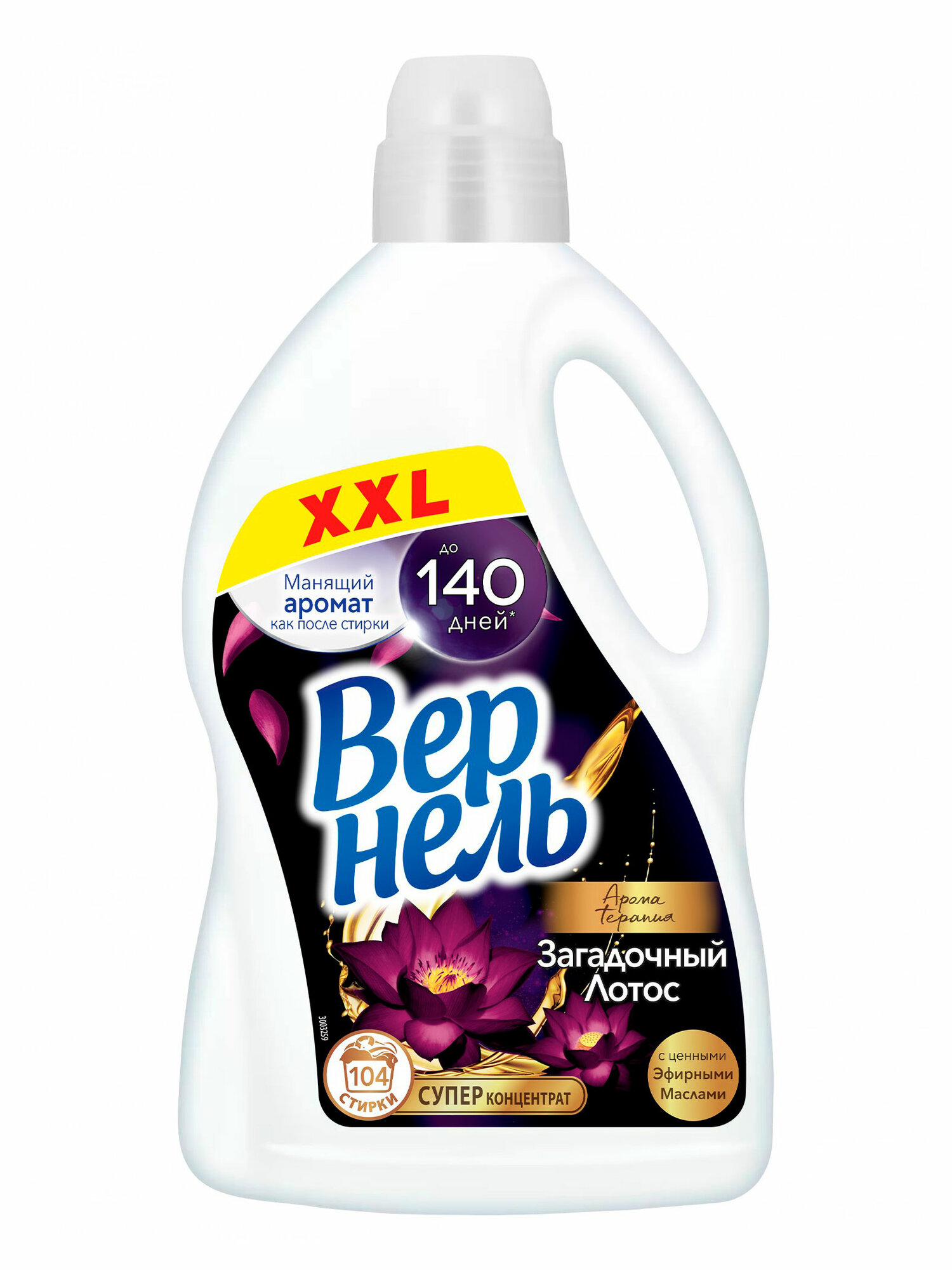 Парфюмированный кондиционер концентрат для белья Вернель Ароматерапия Загадочный лотос 2610 мл, (104 стирки) подарит Вашему белью не только невероятную мягкость, но и магический аромат лотоса, а благодаря специальным аромакапсулам в составе кондиционер для стирки Вернель позволит наслаждаться интенсивным ароматом белья до 140 дней. Преимущества кондиционера для белья Вернель: -кондиционер для белья обеспечивает аромат до 140 дней (при хранении белья без использования) -кондиционер содержит в составе эфирные масла, дарящие вдохновение для души и тела -кондиционер для стирки придает приятный аромат и мягкость белью -кондиционер для стирки облегчает глажку и обладает антистатическим эффектом -дарит чувственный яркий аромат черной орхидеи с яркими оттенками пачули -на одну стирку достаточно меньше половины колпачка Подходит для всех видов тканей. Избегайте непосредственного контакта средства для стирки с тканью.