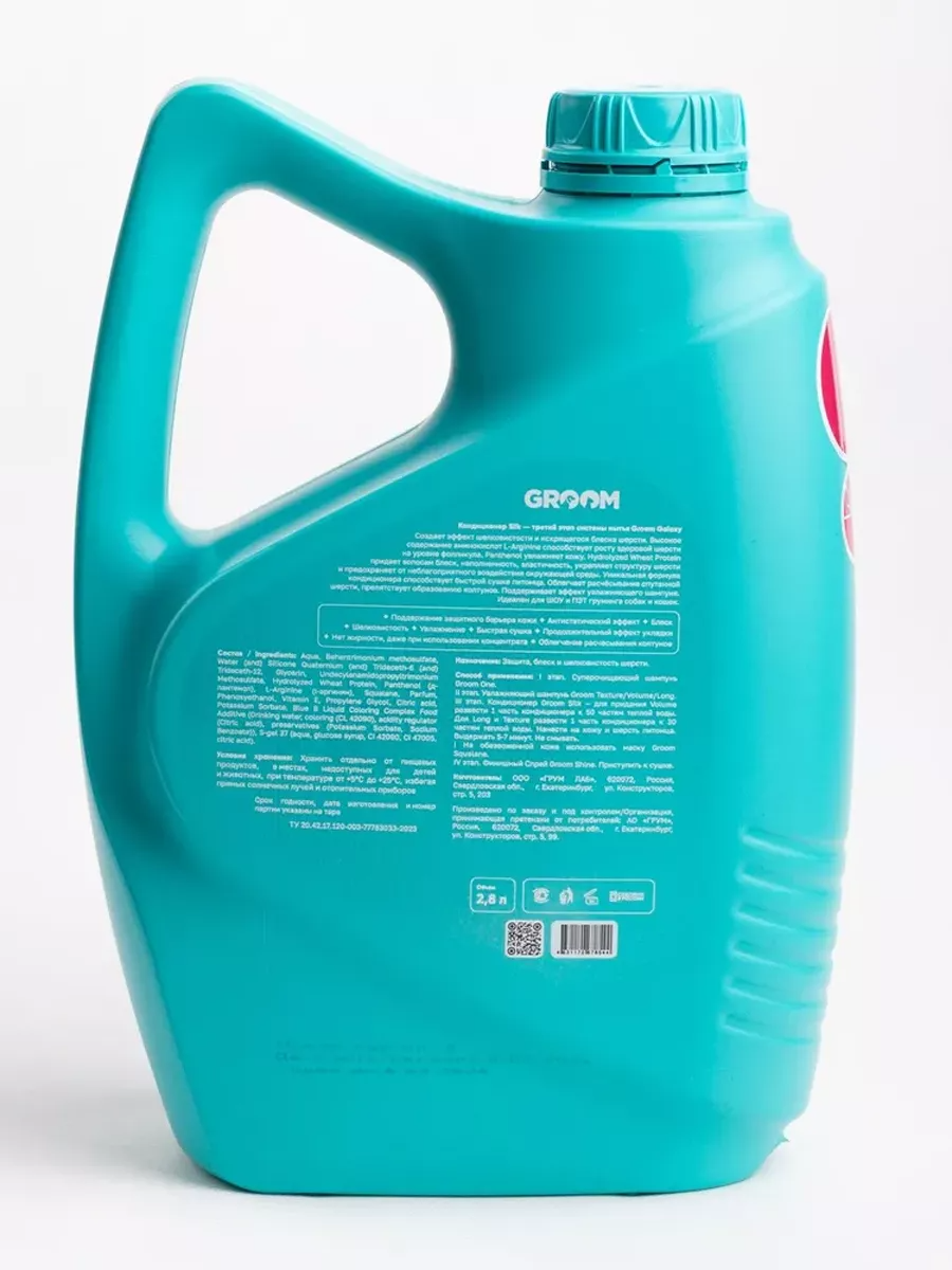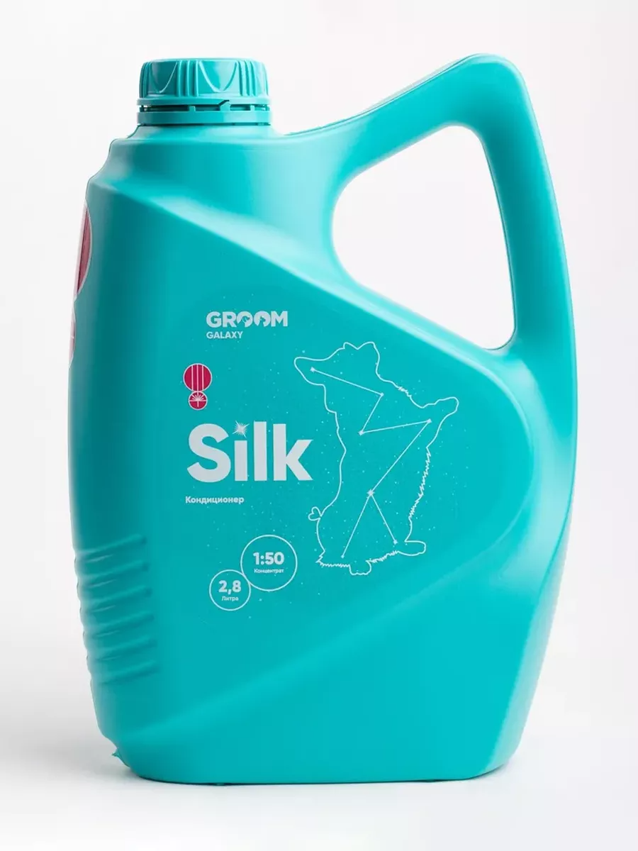 Кондиционер Silk Groom Galaxy. Cоздает эффект невероятной шелковистости и искрящегося блеска шерсти. Высокое содержание Panthenol увлажняет кожу, аминокислота L-Arginine, проникая в структуру волоса и шерсти, закрепляться на участках, которые сильно повреждены, восполняя их, обеспечивает восстановление и улучшение структуры волоса. Проникая в волосяной фолликул L-Arginine увеличивает микроциркуляцию в нем, обеспечивая усиленное поступление питательных веществ, что способствует росту здоровой шерсти. Hydrolyzed Wheat Protein глубоко проникают в структуру волоса, укрепляя его изнутри. Инновационная формула кондиционера обеспечивает быструю сушку питомца. Облегчает расчёсывание спутанной шерсти, препятствует образованию колтунов. Поддерживает эффект увлажняющего шампуня. Идеален для ШОУ и ПЭТ груминга собак и кошек. Развести 1 часть кондиционера к 50 частям теплой воды. Нанести на кожу и шерсть питомца. Выдержать 5-7 минут. Сполоснуть НЕ горячей водой.