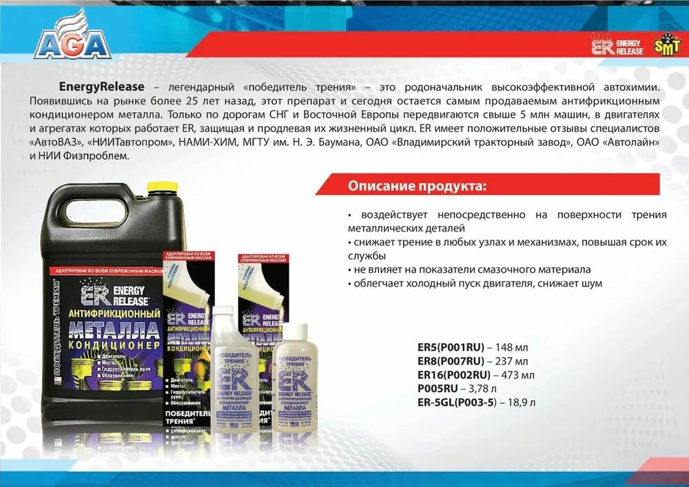 ER® не является смазочным материалом, так как обладает принципиально иным трибологическим эффектом и воздействует непосредственно на поверхности трения металлических деталей. Он подается в узлы трения с имеющимся носителем – моторным или трансмиссионным маслом, пластичной смазкой, топливом (дизельным, бензином).