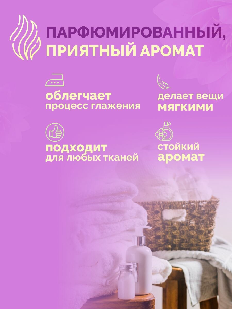 - Облегчает глажку и устраняет загрубелости тканей, делая их более гладкими и легкими для сглаживания.