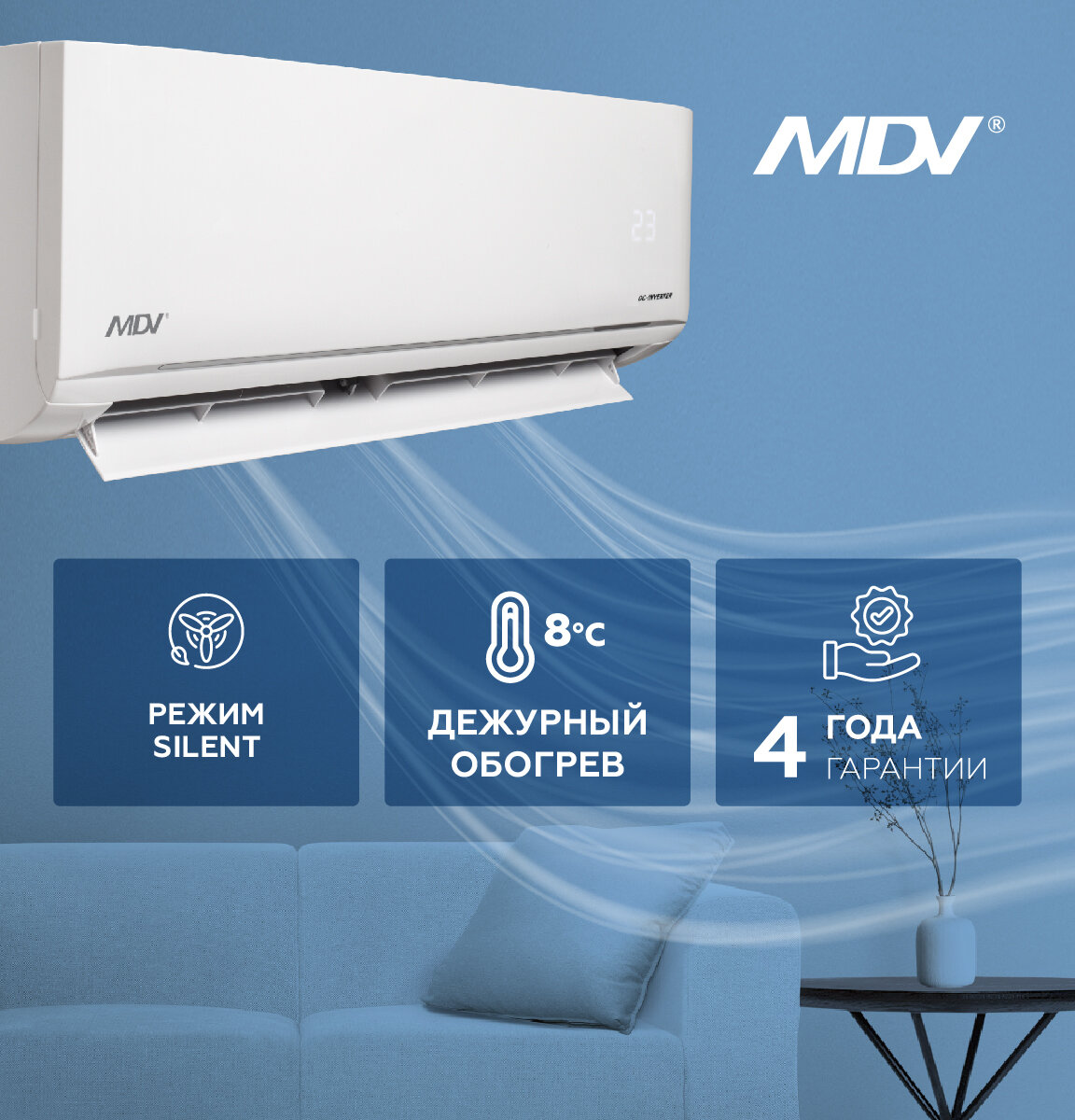 Высокая надежность и долгий срок службы инверторных сплит-систем бренда MDV серии INFINI гарантированы - срок гарантии составляет 4 года. Предусмотрены опции обнаружения утечки хладагента и самодиагностики – при нештатном режиме кондиционер останавливает свою работу до устранения причины, а на дисплее высвечивается соответствующий код ошибки. Вместе с тем сплит-система MDV может эксплуатироваться в условиях нестабильных электрических сетей (диапазон 169-265 В), что подтверждено тестовыми испытаниями и сертификатами.