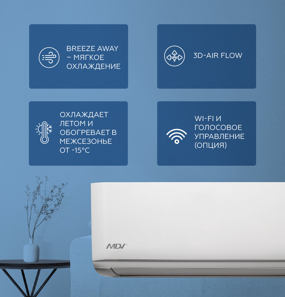 температурная компенсация обеспечивается в сочетании с функцией Follow me – датчик контроля температур находится в пульте дистанционного управления, что позволяет избежать переохлаждения помещения, снизить риск простудных заболеваний и оптимизировать энергопотребление.