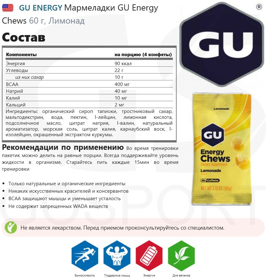 Купить GU ENERGY Мармеладки GU Energy Chews 2 x 60 г, Лимонад с доставкой по всей России. GU ENERGY Мармеладки GU Energy Chews 2 x 60 г, Лимонад: сравнение цен, характеристики, фото, актуальное наличие и цены.