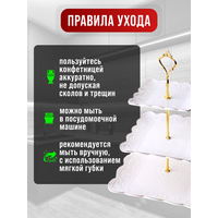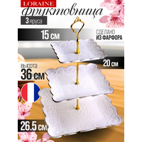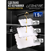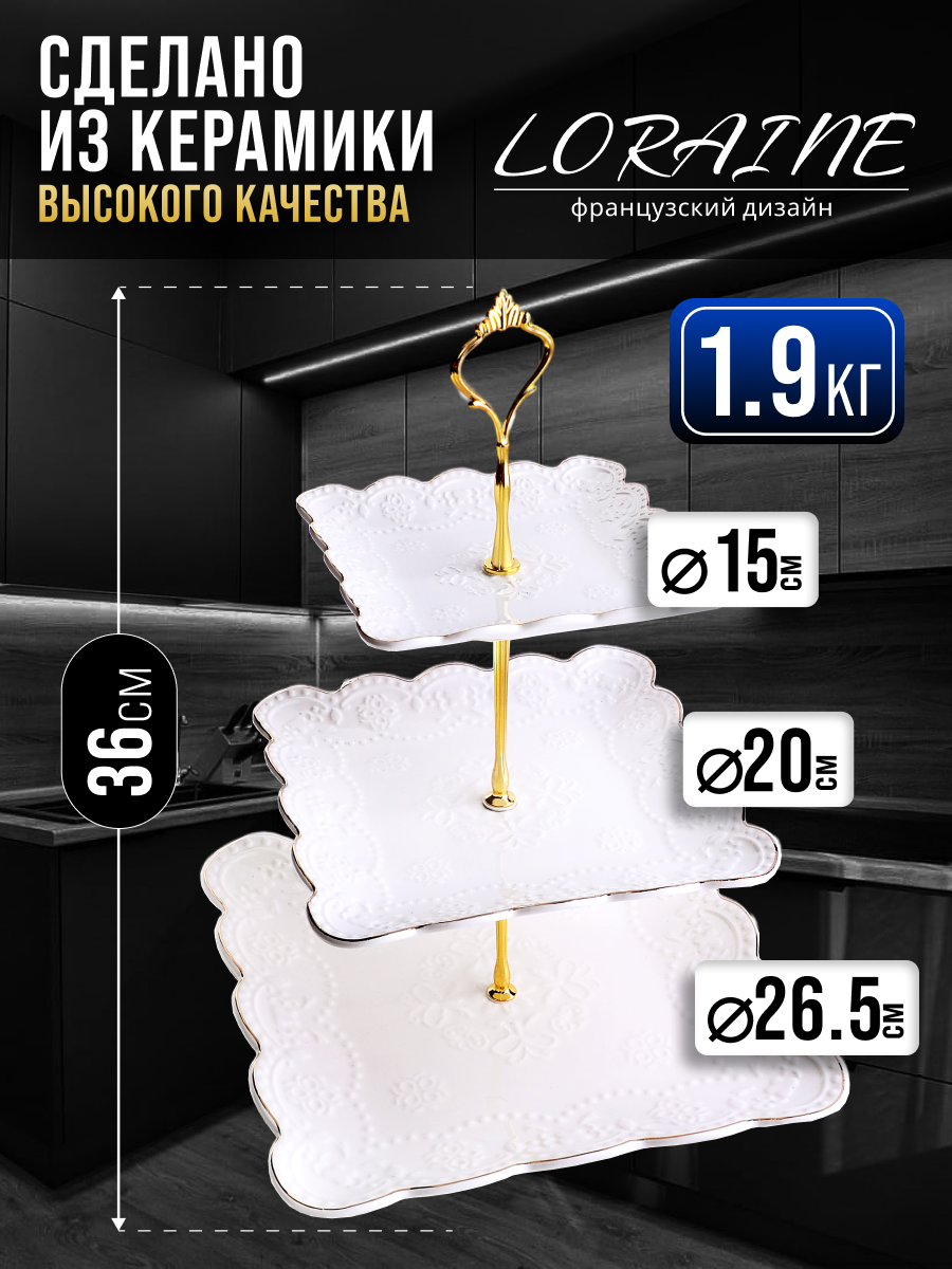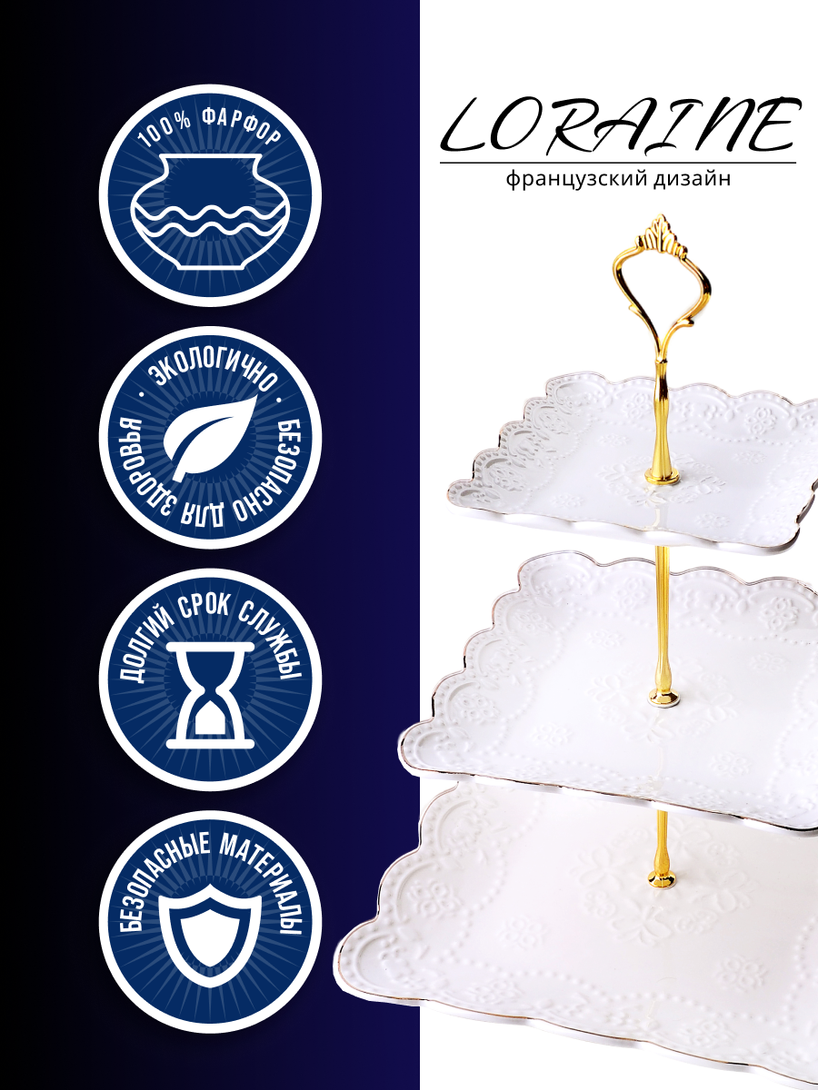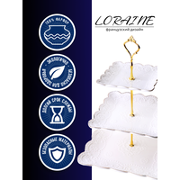 Элегантная конфетница LORAINE, выполненная из керамики, сочетает в себе изысканный дизайн с максимальной функциональностью. Конфетница состоит из 3 х ярусов разного размера и предназначена для красивой сервировки конфет, фруктов и десертов. Ярусы конфетницы оформлены оригинальным золотым орнаментом. Стойка держатель конфетницы выполнена из стали. Конфетница украсит сервировку вашего стола и подчеркнет прекрасный вкус хозяина, а также станет отличным подарком.