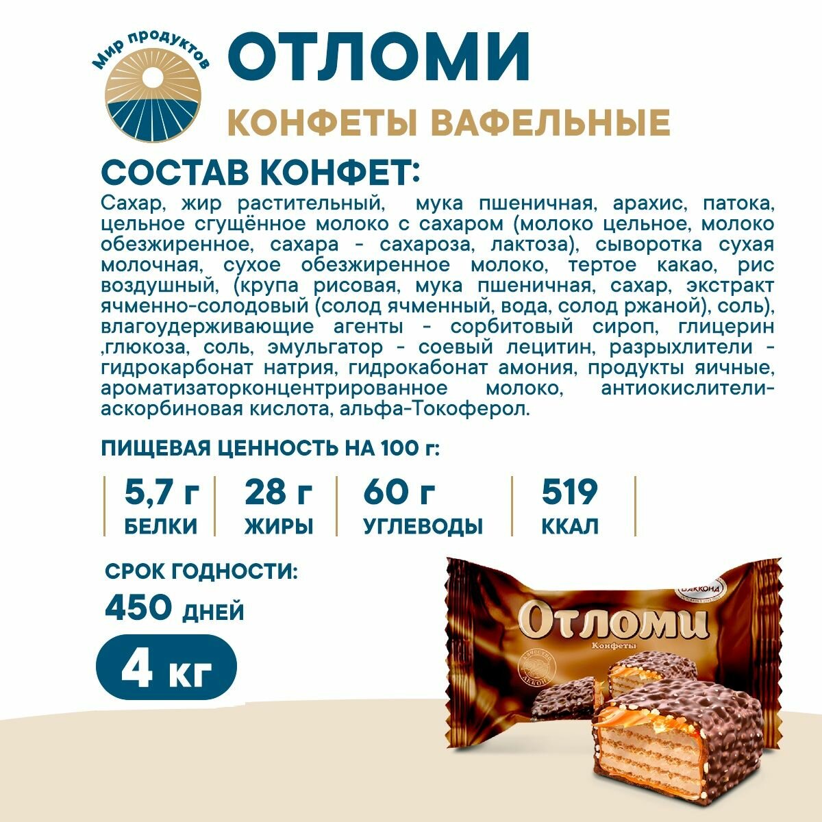 Конфеты "Отломи" - это оригинальное сочетание вкусов и текстур. Конфеты "Отломи" глазированы молочным шоколадом, который придает им неповторимый вкус и аромат. Внутри каждой конфеты находится кремовая начинка, которая дополняет вкус молочного шоколада. Особенностью конфет "Отломи" является добавление воздушного риса и арахиса, что делает их еще более вкусными и питательными. В целом, конфеты "Отломи" - это отличный выбор для любителей сладкого и тех, кто ценит качество и натуральность продуктов.
