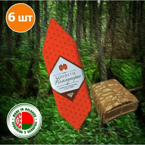 Конфеты Коммунарка вафельные (крупный корпус), 6 шт. Большая вафельная конфета с помадной начинкой, имеющей вкус и аромат коньяка в шоколадной глазури, произведенная белорусской кондитерской фабрикой "Коммунарка". Масса одной конфеты около 170 грамм, поэтому такая разновидность конфет похожа на небольшой вафельный тортик. Добавки алкоголя (бренди) в начинке придают конфете праздничный вкус и аромат.