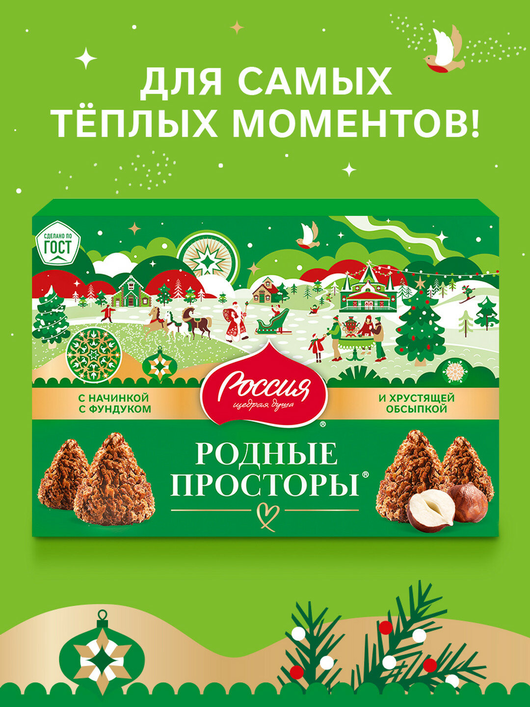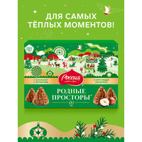 Конфеты родные просторы с нежной начинкой с фундуком, покрытые шоколадной глазурью и хрустящей вафельной крошкой с какао произведены по высоким стандартам качества ГОСТ. Лимитированный дизайн упаковки станет украшением любого торжества. Дарите удовольствие себе и своим близким!