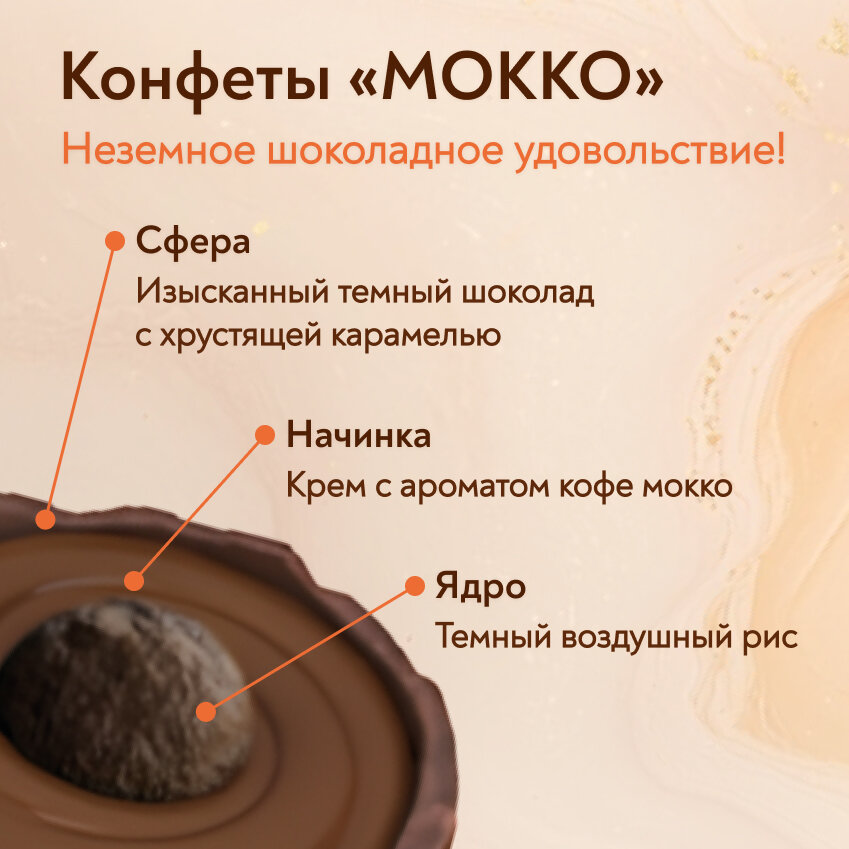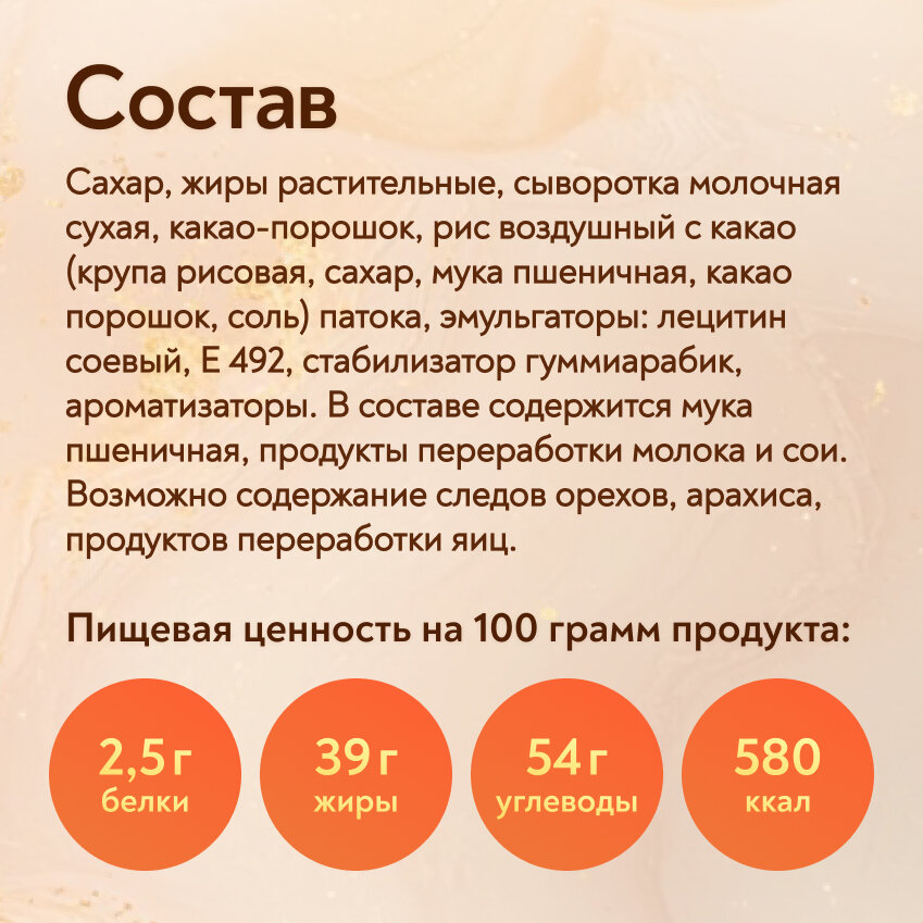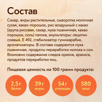 | Состав | Заменитель какао масла, какао порошок, сахар, сухое обезжиренное молоко, рис воздушный, ванилин, лецитин, ароматизатор идентичный натуральному, глазирователь квик |