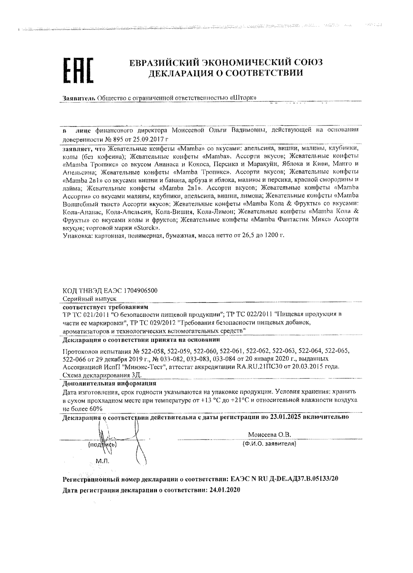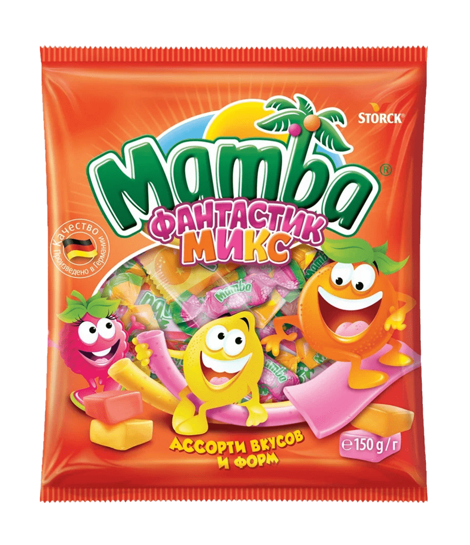 Mamba – это жевательные лакомства с разнообразными фруктовыми вкусами, которые очень популярны не только у детей, но и у взрослых. Достоинство Фантастик микс в том, что конфеты прямо во рту меняют свой вкус. Красочный цвет и форма в виде палочки станут забавным развлечением для ребенка, ведь сладости можно гнуть, растягивать или мять. Продаются в большой упаковке 150 гр. В каждой упаковке по 24 желейные конфеты. Присутствует ананасовый, апельсиновый, клубничный, вишневый, яблочный и арбузный вкусы. В пачке 3 разные формы конфет – плоские, трубочки и в виде обычных карамелек.
