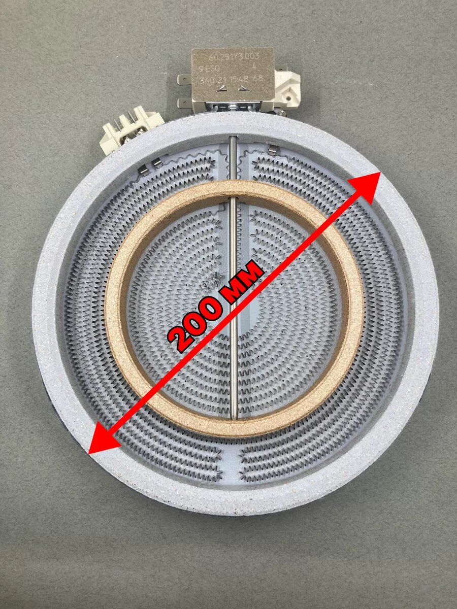 Двухзонная конфорка для плит и варочных поверхностей. Используется для стеклокерамики. Две зоны нагрева. Мощность спиралей 1700Вт / 700Вт. Производитель E.G.O, Италия, парт номер изделия 10.58211.004. Данная конфорка подойдет для плиты Ariston, Indesit, Hotpoint, Whirlpool, Teka. Взаимозаменяема с партномерами C00525921 , C00377912 , 481231018893 , 481281718742 , 60702010. Может быть подобрана по внешнему виду - при этом вам нужно обратить внимание на размер конфорки и подключению. При необходимости можем проверить совместимость данной конфорки с вашей плитой по запросу.
