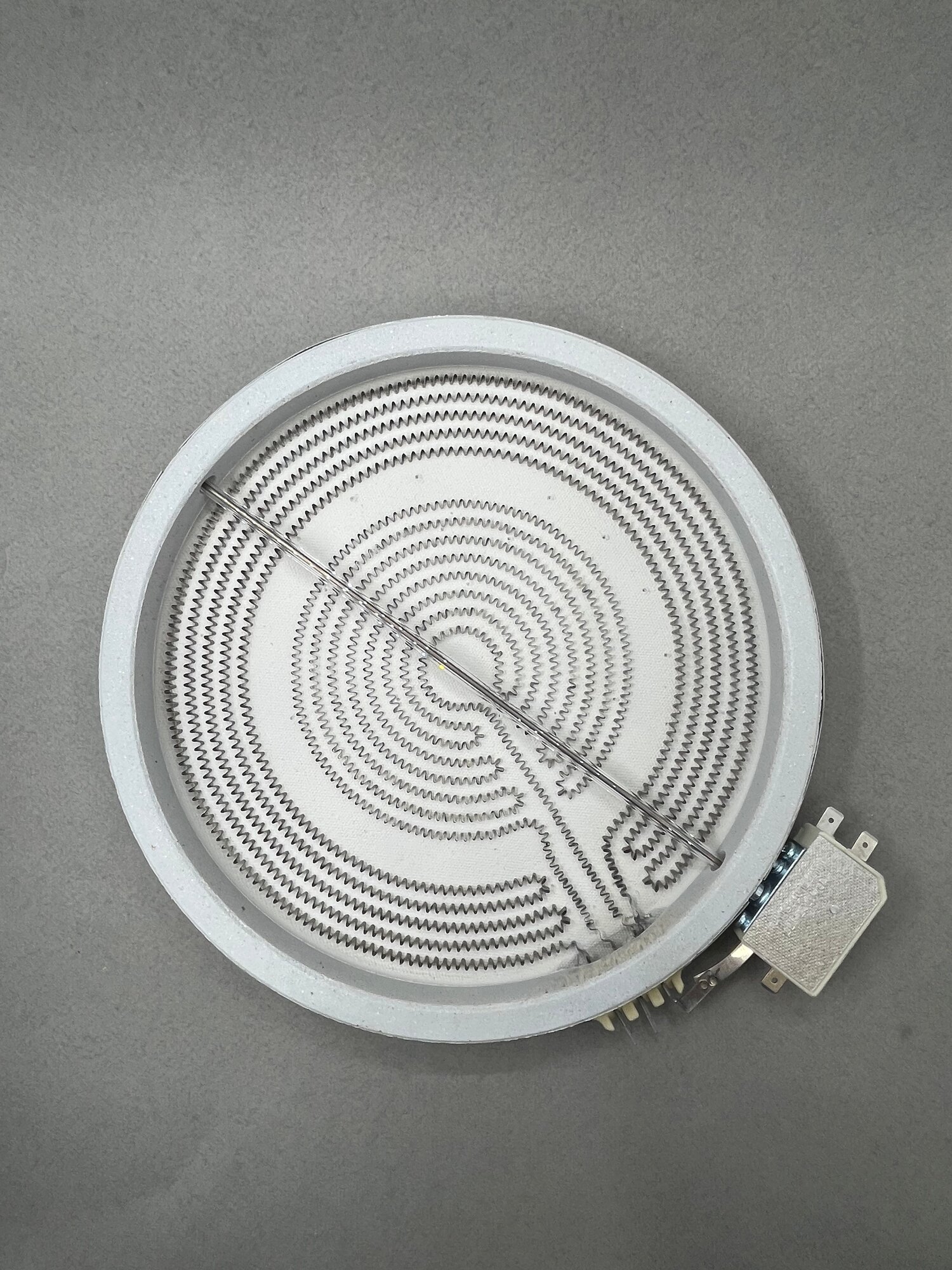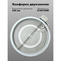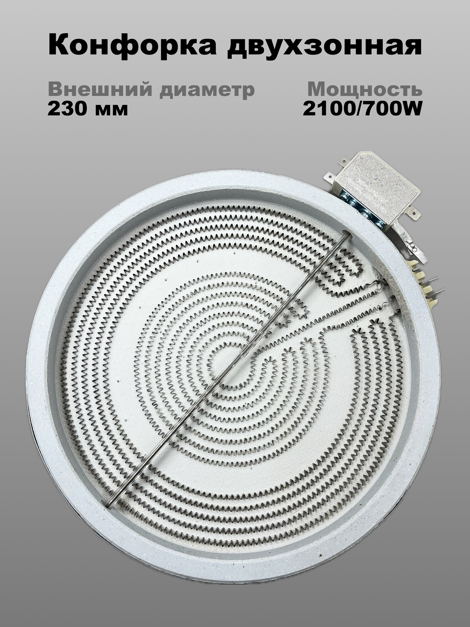 Конфорка для плиты и стеклокерамических поверхностей. Универсальная запчасть. Внешний диаметр 230 мм. Производитель Китай. Электрическая конфорка имеет две зоны нагрева. Мощность 2100/700W. Электроконфорка поставляется с парт номером C00339918. Для стеклокерамиx варочных поверхностей Mora, Ardo, Bosch, Siemens, Lex, Gorenje, Indesit, Ariston, Hotpoint, Bauknecht, Hansa, Whirlpool, Candy, Haier, Zanussi, Electrolux, Aeg, Ikea, Kuppersberg, Beko, Zigmund & Shtain и других. Может быть подобрана по внешнему виду. Обратите внимание на диаметр конфорки и клеммы подключения.