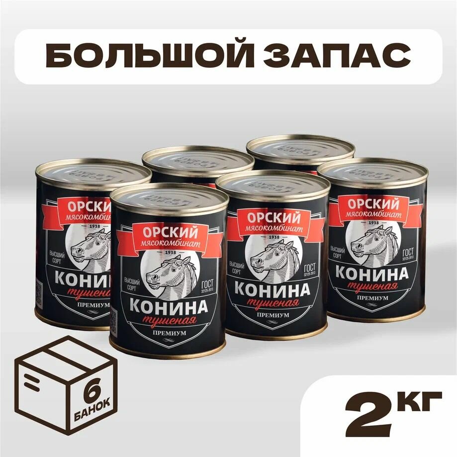 Конина тушеная высший сорт «Премиум» ГОСТ, в наборе 6 шт по 338гр, Орский мясокомбинат: сравнение цен, характеристики, фото, актуальное наличие и цены.