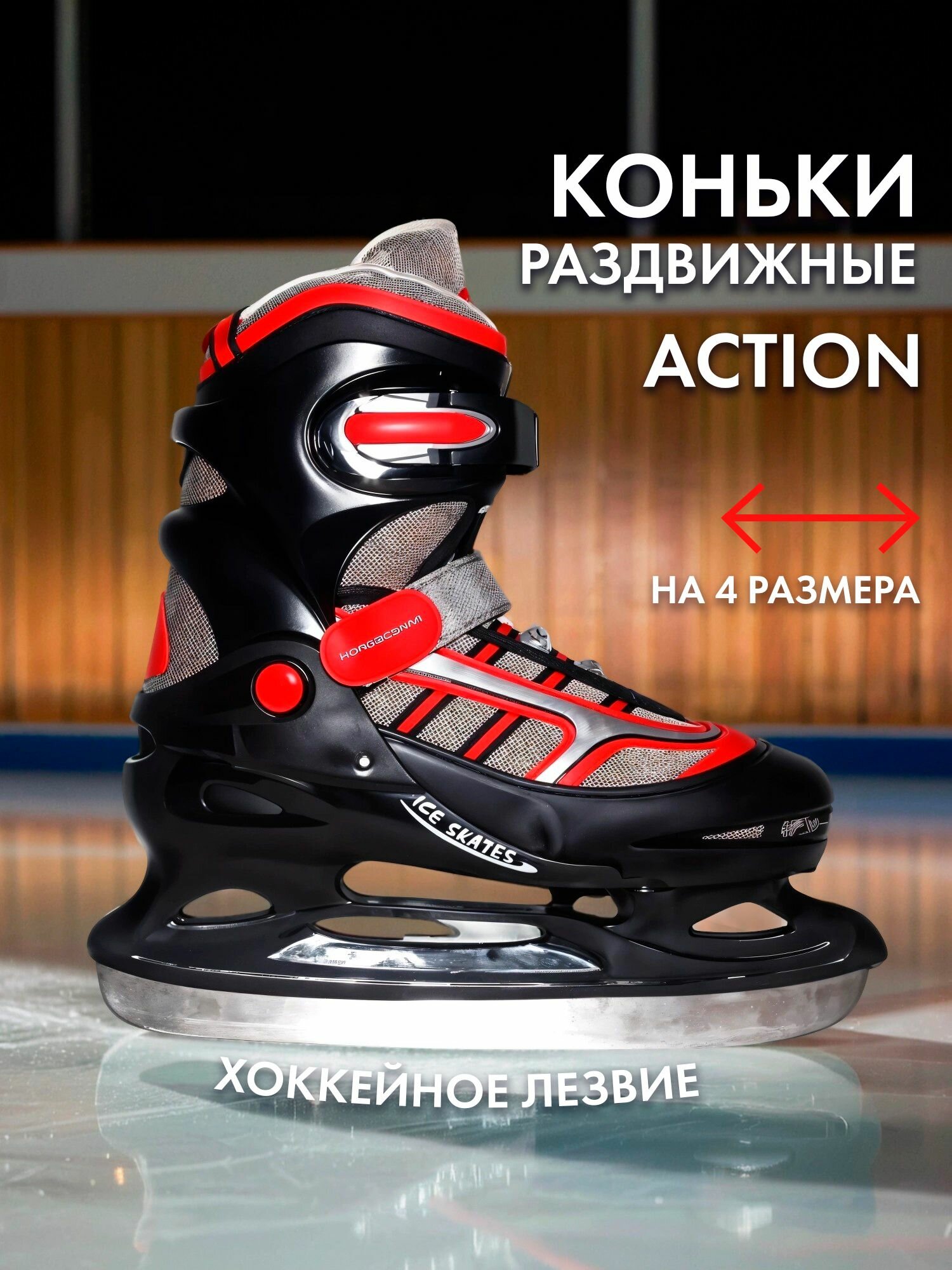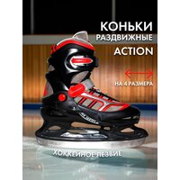 Раздвижные хоккейные коньки Action придутся по вкусу начинающим хоккеистам. Жесткая колодка и шнуровка, надежно фиксирует ногу, предотвращая возможность вывихов и травм. Манжета на липучке и прочная клипса, обезопасят Вашего ребенка и обеспечат максимально комфортное катание. Мягкий ботинок из нейлона, усилен полиуретановым каркасом. Внутренняя подкладка и стелька изготовлены из синтетического материала, позволяющего сохранить комфорт и тепло во время катания. Отличительная особенность данной модели коньков - раздвижная конструкция. Она популярна в детских моделях, так как есть возможность увеличить коньки на четыре размера и не приобретать новые коньки вслед за ростом ноги ребенка.