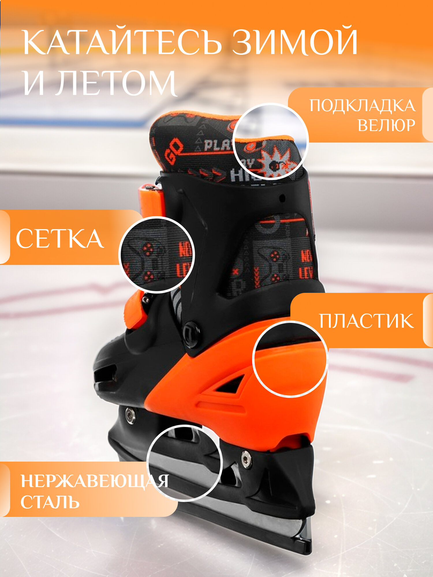 Коньки подходят для катания на открытом льду и крытых катках. Их легко надеть, отрегулировать и зафиксировать с помощью пластиковых клипс, которые расположены на голенище и в области ступни.